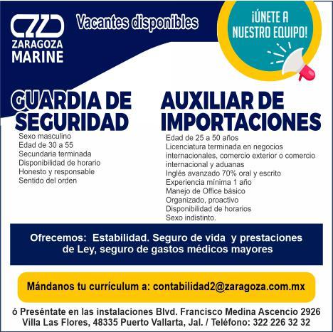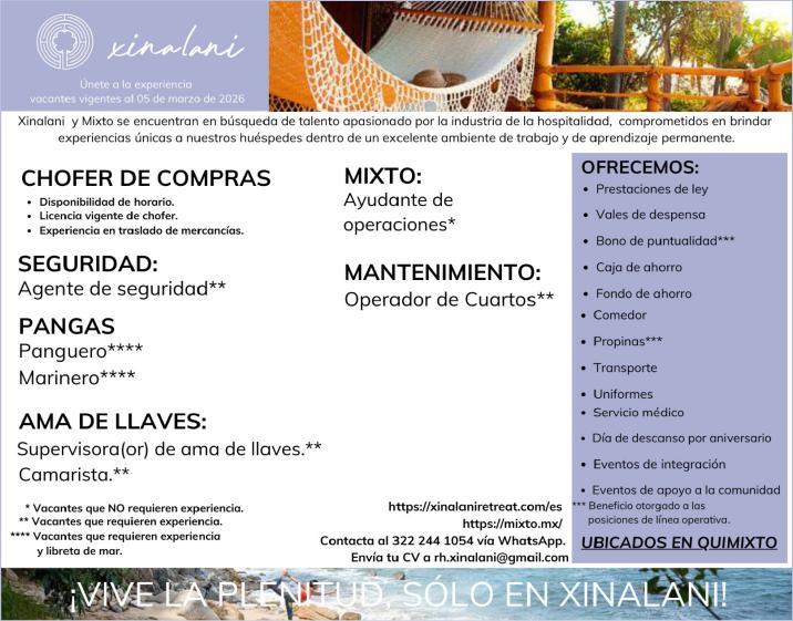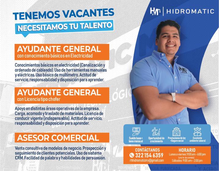 Estamos solicitando en diferentes áreas administrativas, operativas y de servicios, muchas vacantes. Interesados acudir a Av. de Los Tules N. 169, col. Jardines Vallarta.