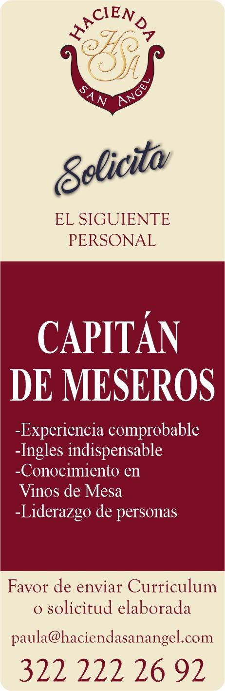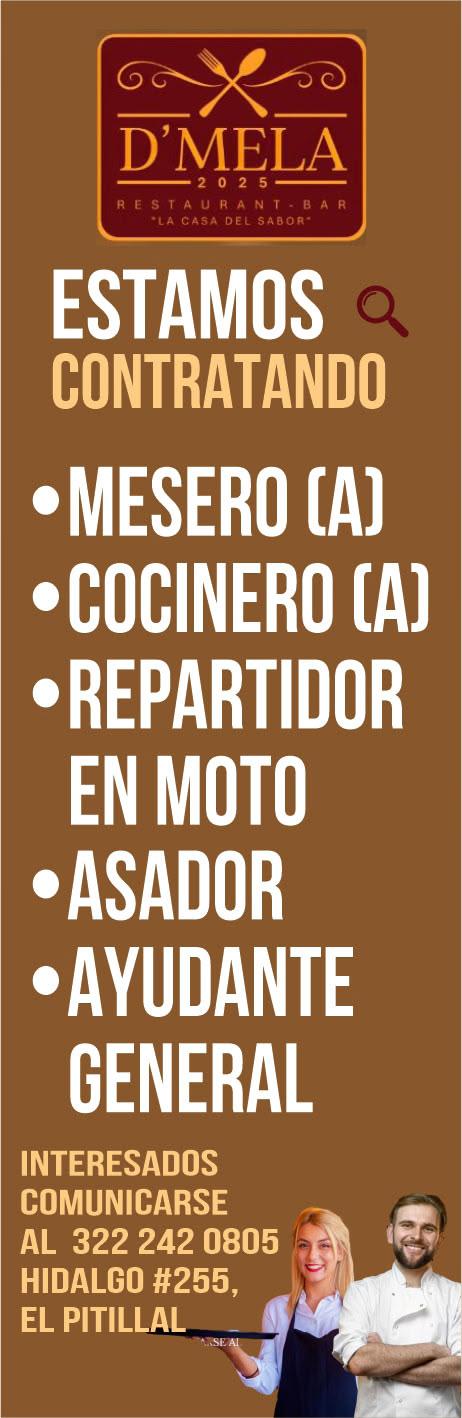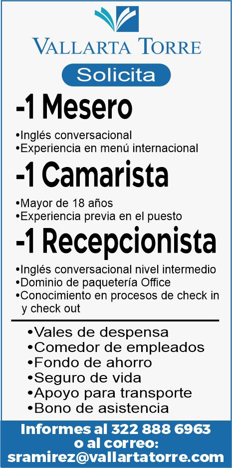 Solicitamos mesero, camarista, recepcionista. Interesados pedir informes al tel. 322 88 869-63.+