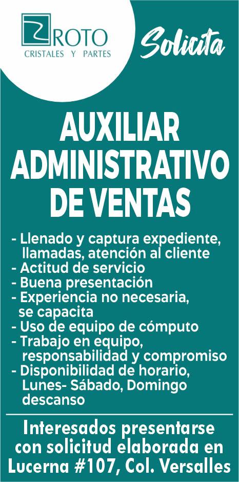 trativo de ventas. Interesados presentarse con solicitud de trabajo en Lucerna #107 col. Versalles.