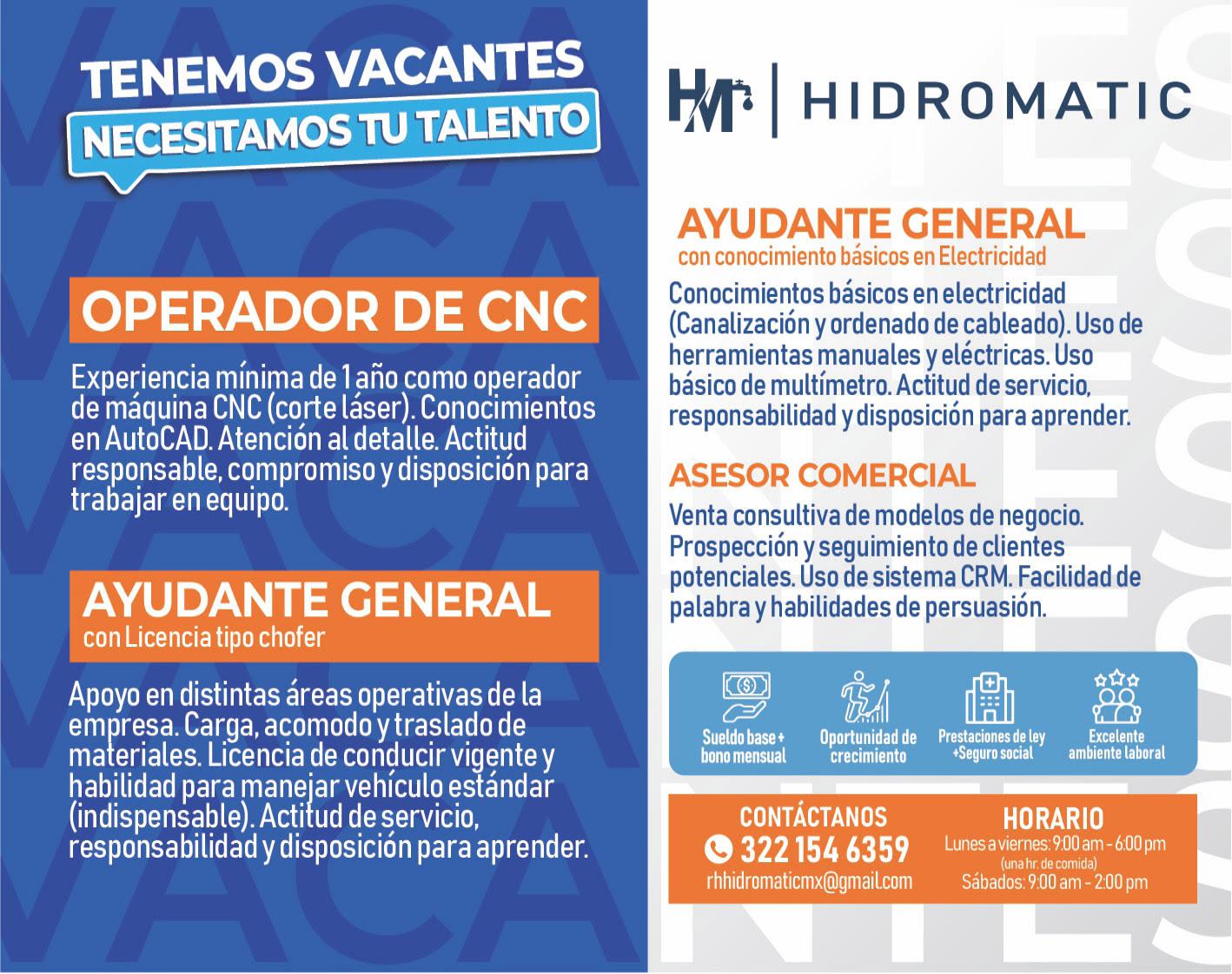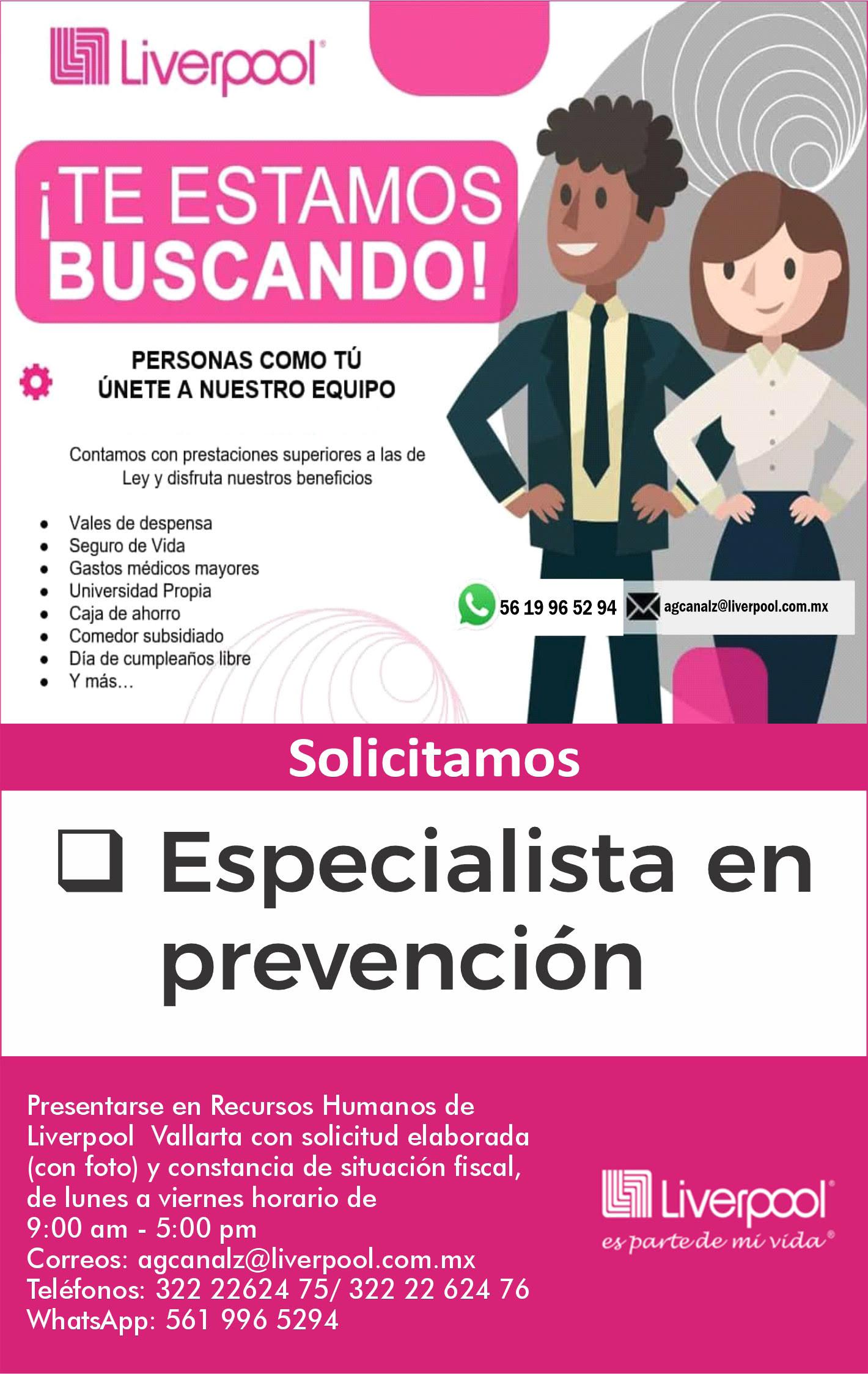 Solicitamos especialista en prevención. Pide cita a RH de 9am a 5pm al tel. 322 21 666-26.+