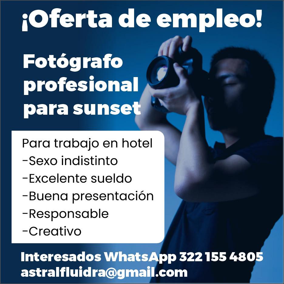 Oferta de empleo, fotógrafo profesional para sunset. WhatsApp. 322 15 548-05.+