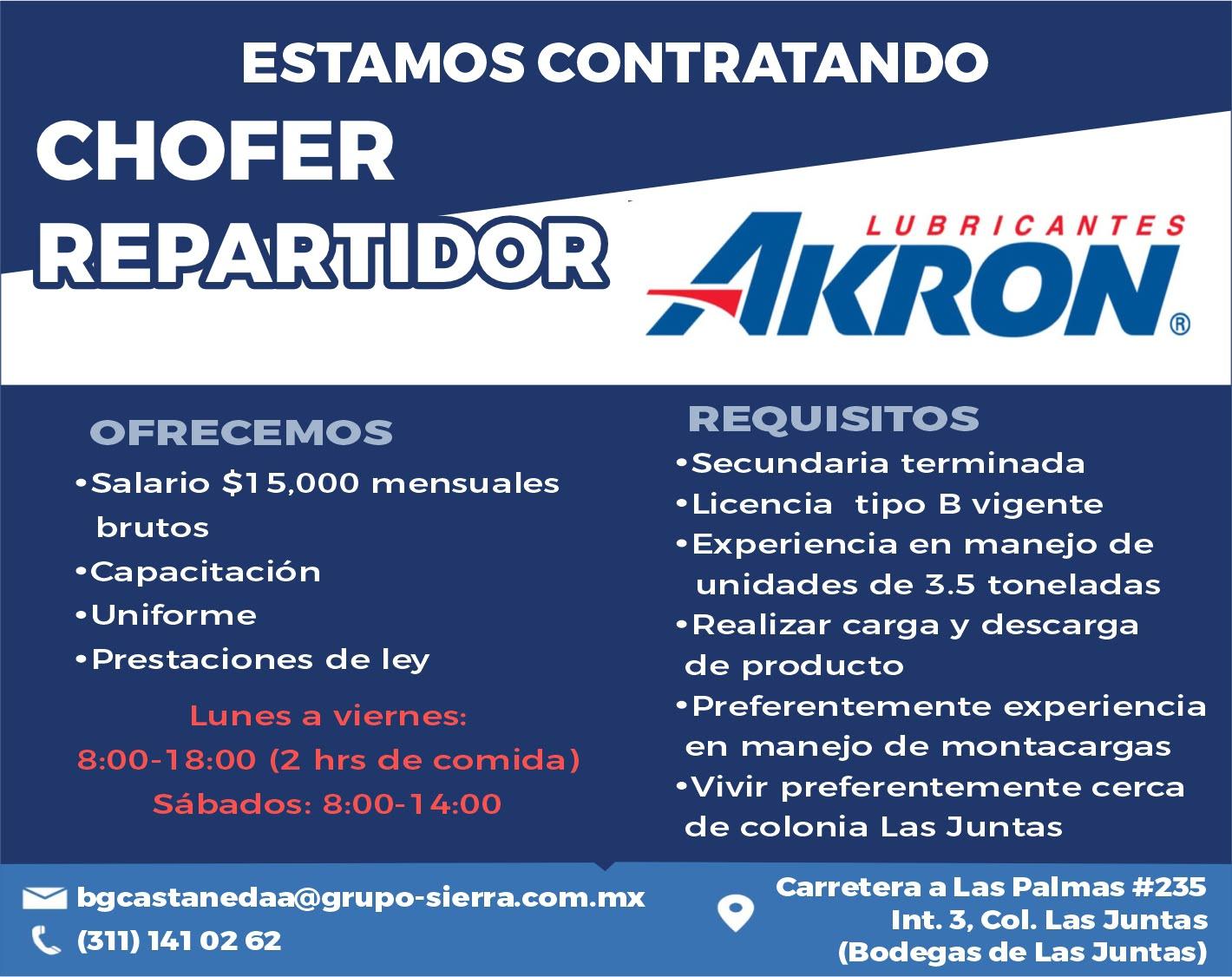 Estamos contratando chofer repartidor, salario $15mil mensuales. Tel. 311 14 102-62.+