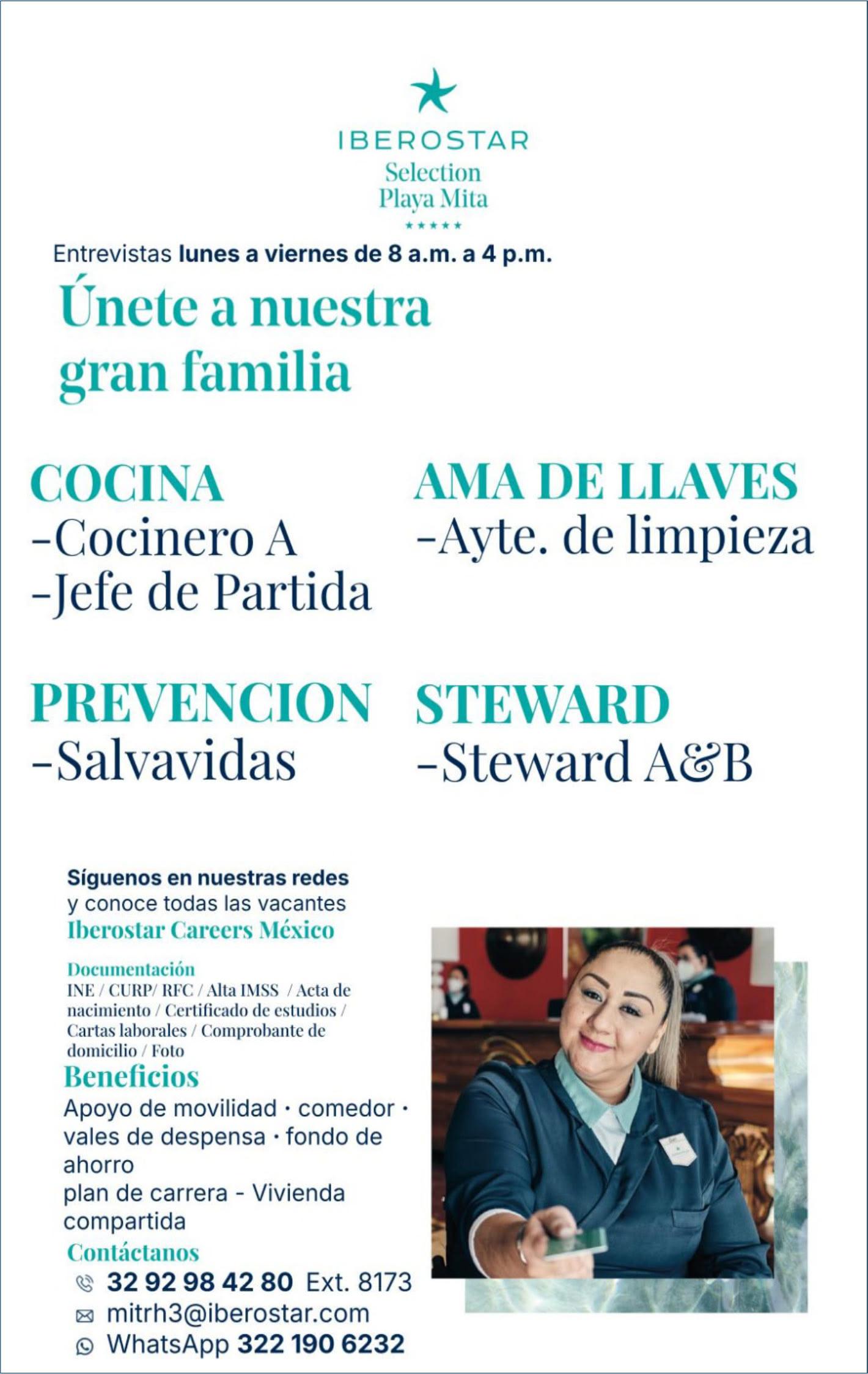 Área de Nuevo Vallarta, solicitamos, aux. de almacén, steward, mesero. Presentar solicitud elaborada. Inf. 322 29 704-03.+