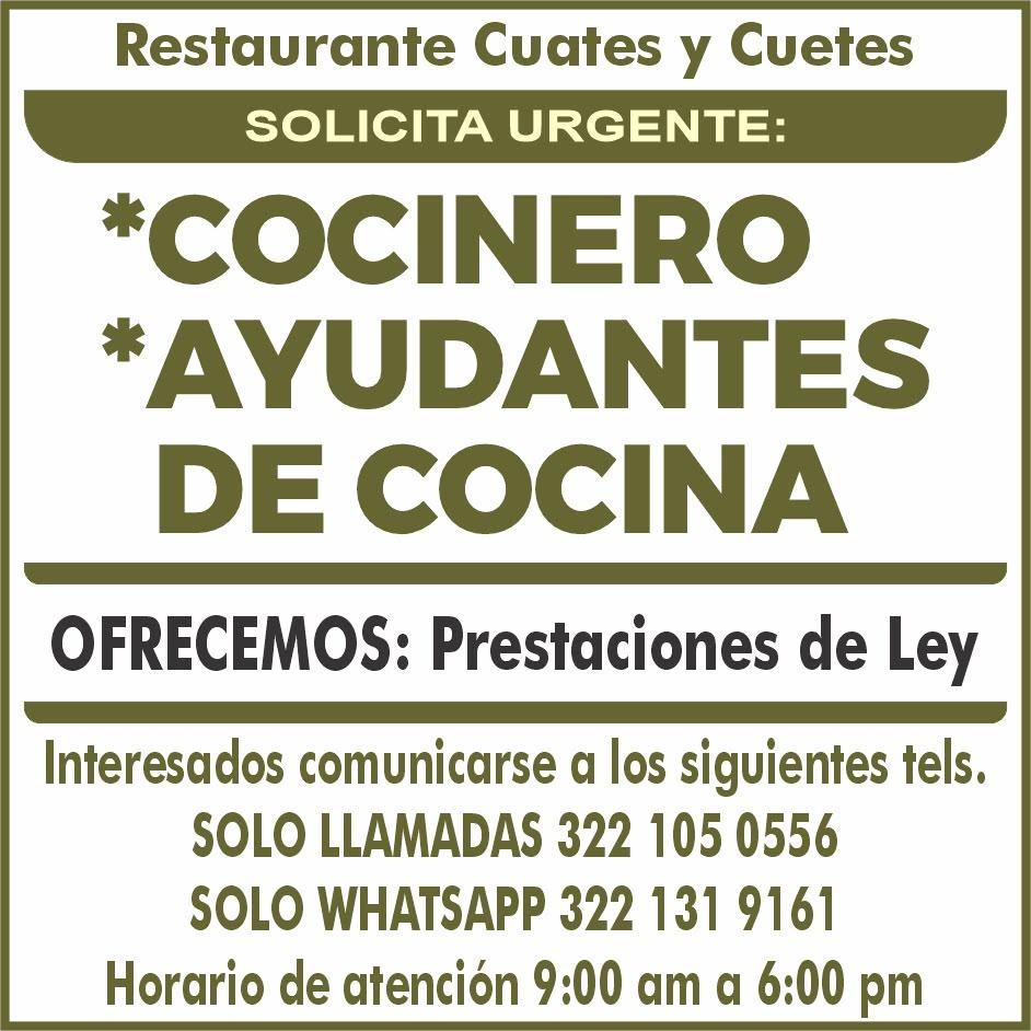 Se solicita urgente: Ayte. de cocina, cocinero, persona para inventarios y almacén. Solo llamadas, no mensajes de 9:00 am a 6:00 pm al. 322 13 19161.+