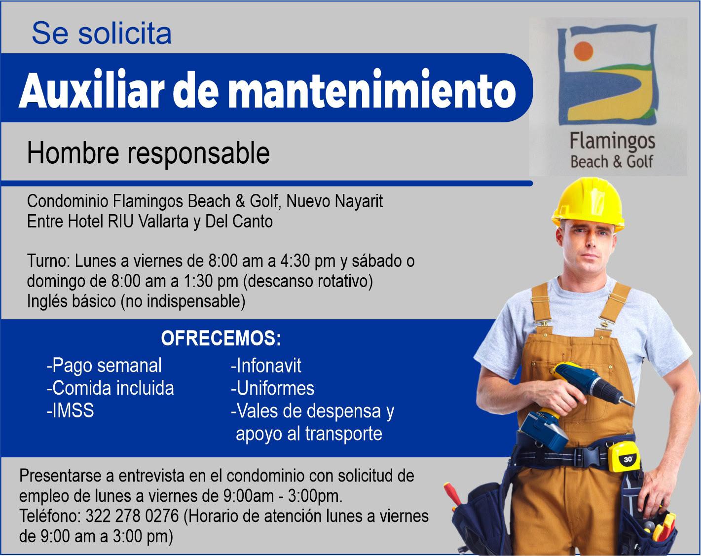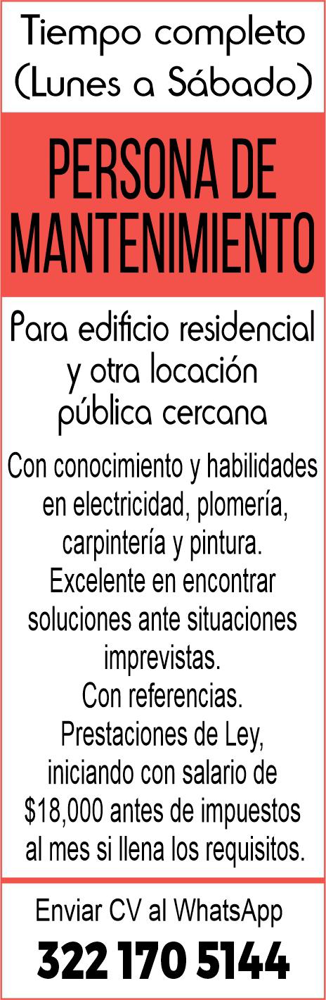 Se solicita personal de mantenimiento tiempo completo. Enviar WhatsApp. 322 17 05144.+