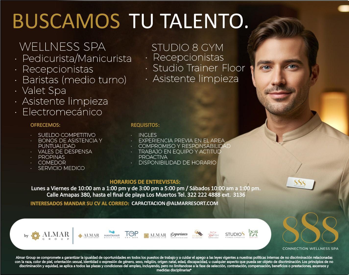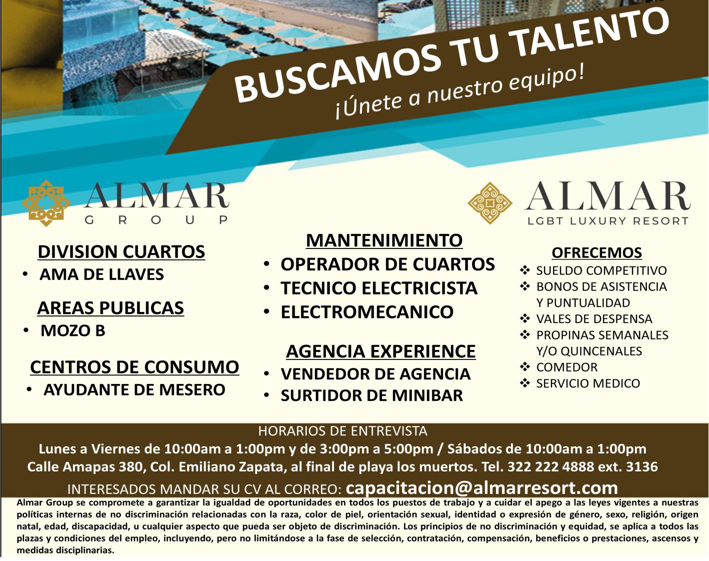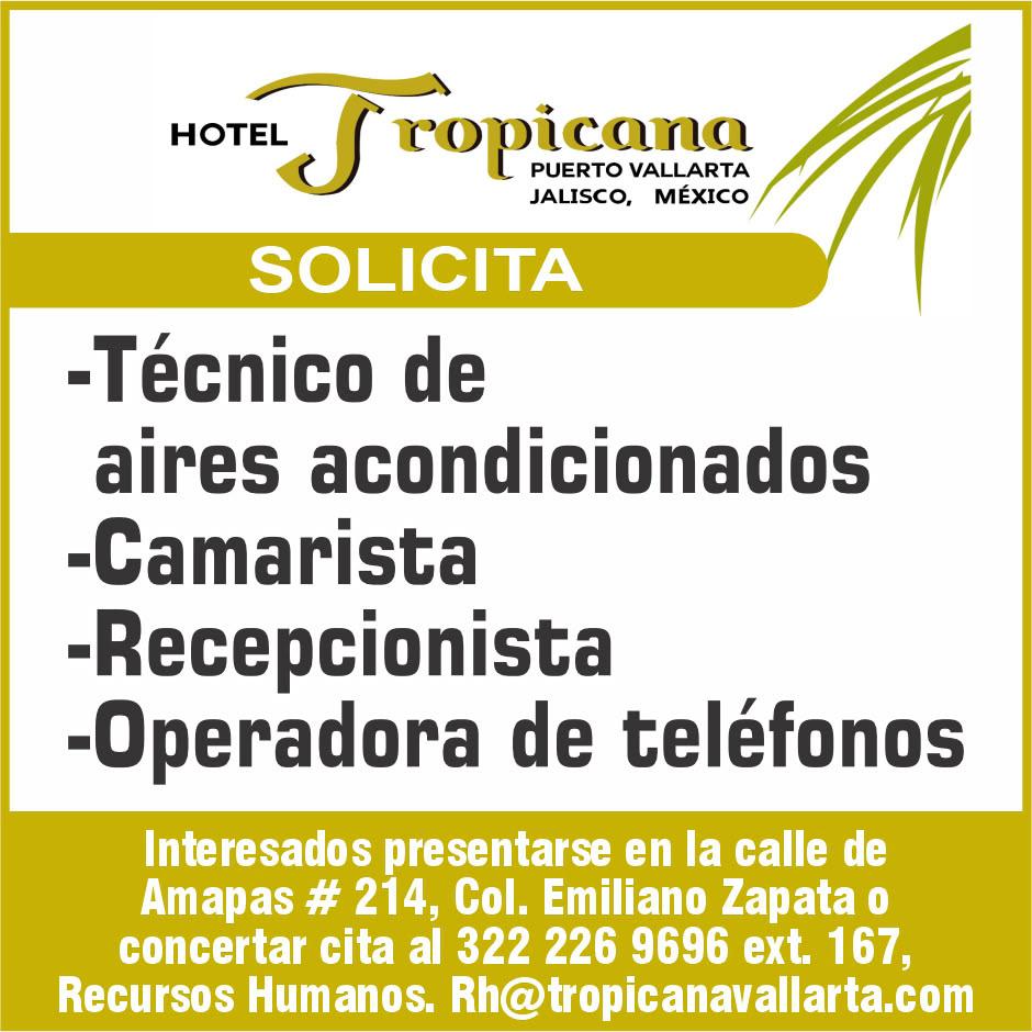 Estamos en busca de Técnico de aires acondicionados, Camarista, Recepcionista y Operadora de teléfonos. Concertar cita al. 322 22 696-96, Ext. 167.+