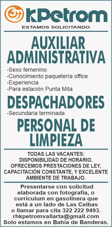 Se solicita Auxiliar de Gerencia Administrativa, sexo indistinto, inglés avanzado, manejo paquete Office, organizado, proactivo, conocimiento de protocolos de seguridad, manejo de personal. Inf. 322 18 22617.+