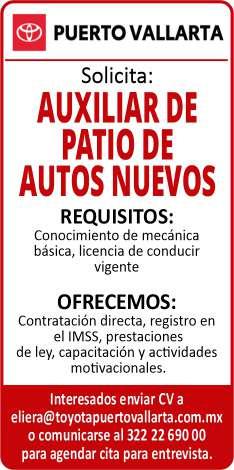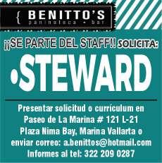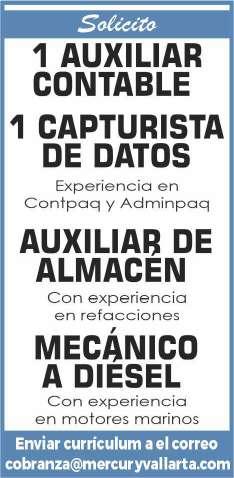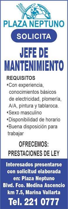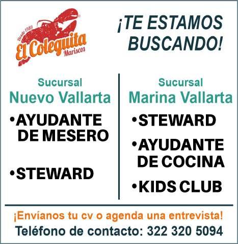 Área de Nuevo Vallarta, solicitamos ayudante de mantenimiento, aux. de almacén, steward, mesero, presentar solicitud ela-