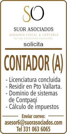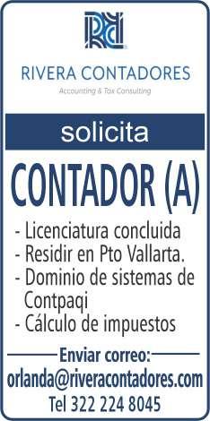 Solicita contador (a), licenciatura concluida y vivir en Puerto Vallarta. Llamar al tel. 331 06 360-65.+