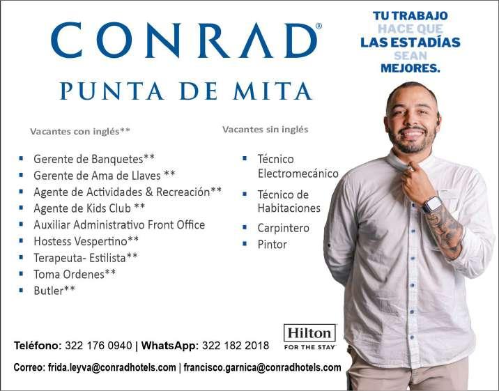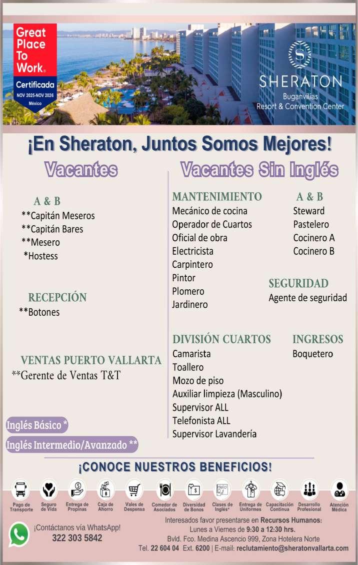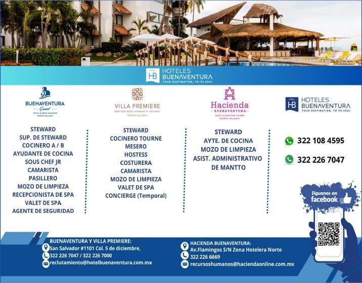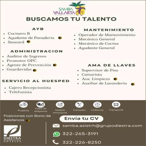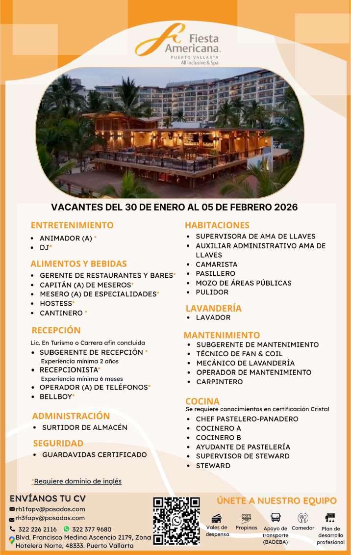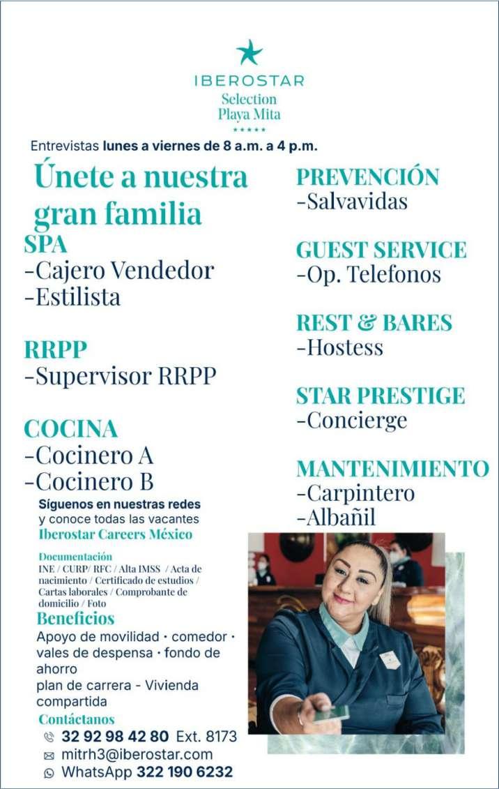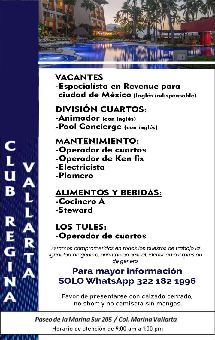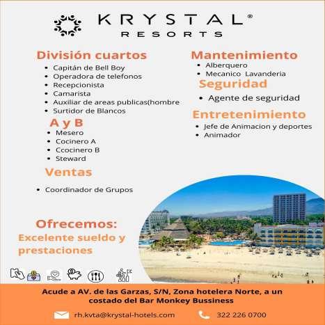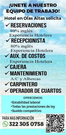 ¡Únete a nuestro gran equipo! Vacantes: Animadores, Aux. de Lavandería, Operador de Cuartos, Albañil, Camaristas, Cocinero A, Guardavidas, Bellboy, Jardinero. Comunícate al. 322 22 666-20, Ext. 8310 y 8311.+