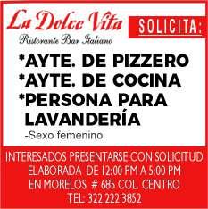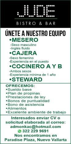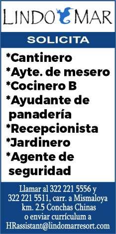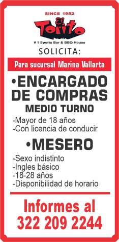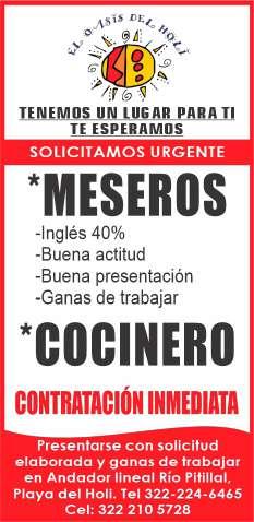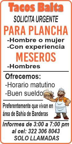 Se solicitan urgentes meseros, ayudantes de meseros, ayte. de bar, ayte. de cocina, cocinero. Solo llamadas de 9:00 am a 6:00 pm, no mensajes. 322 13 191-61.+