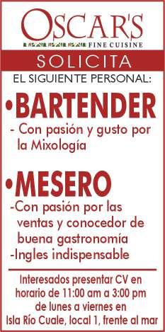 Se solicitan urgentes meseros, ayudantes de meseros, ayte. de bar, ayte. de cocina, cocinero.