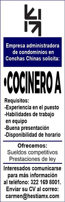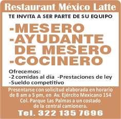 mesero y cocinero. Interesados presentarse con solicitud elaborada en Av. Ejercito Mexicano 154, Col. Parque Las Palmas. Inf. 322 13 576-96.+