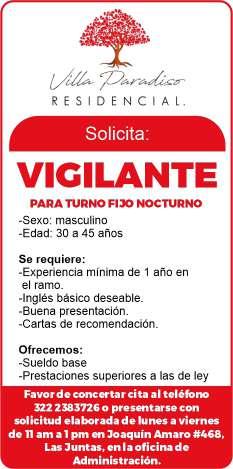 Condominio en Zona Romántica solicita Seguridad, sexo masculino, experiencia comprobable, inglés conversacional, responsable. Informes al. 322 22 318-78.+