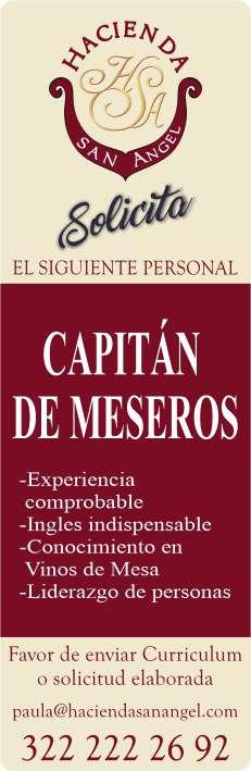 Mesero, Cantinero, Chief steward. Contáctanos al. 322 22 630-46.+