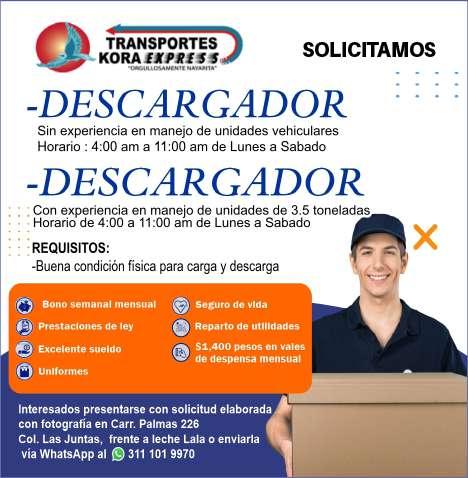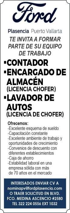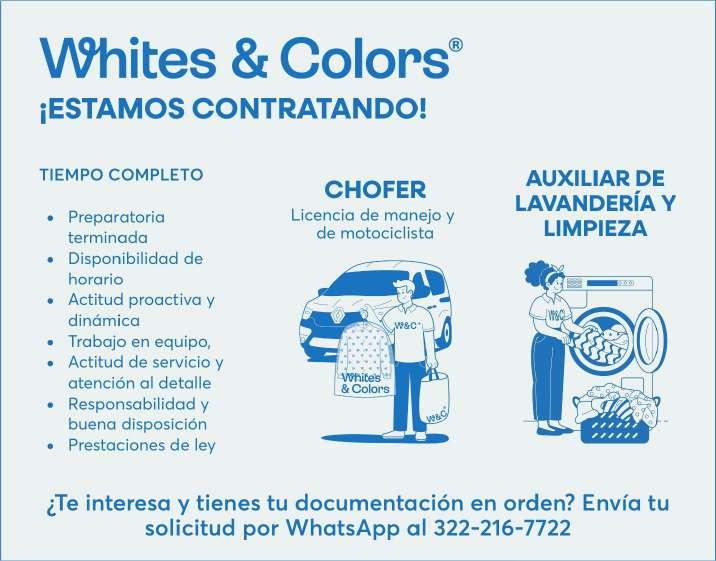 Solicitamos chofer con licencia de manejo y motociclista, auxiliar de lavandería y limpieza. Envía solicitud por WhatsApp al tel. 322 21 677-22.+