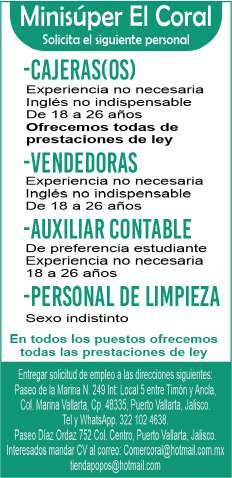 vacantes. Interesados acudir a Av. de Los Tules N.169 Col. Jardines Vallarta.