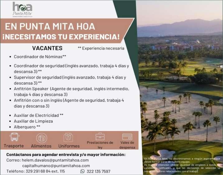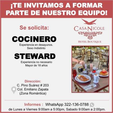 Área La Cruz de Huanacaxtle, solicitamos: Concierge, cocinero A, agente de seguridad, limpieza, lavandería, operador de cuartos. Informes al. 329 29