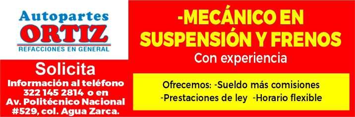 Solicitamos mecánico en suspensión y frenos, con experiencia. Interesados llamar al Tel. 322 14 528-14.+