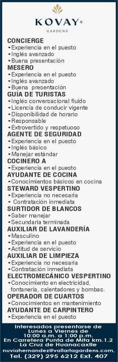 nero A, Guardavidas, Bellboy, Jardinero. Comunícate al. 322 22 666-20, Ext. 8310 y 8311.+