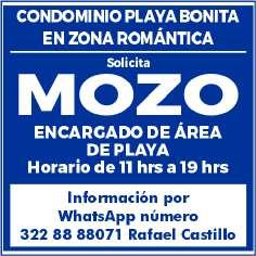 Condominio en Zona Romántica solicita Mozo encargado de área de playa, con horario de 11 a 19 hrs. Información por WhatsApp al. 322 88 880-71.+