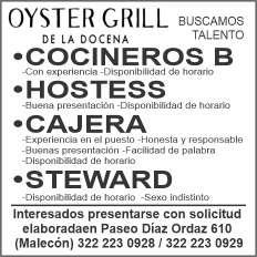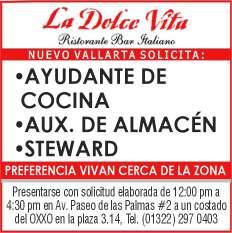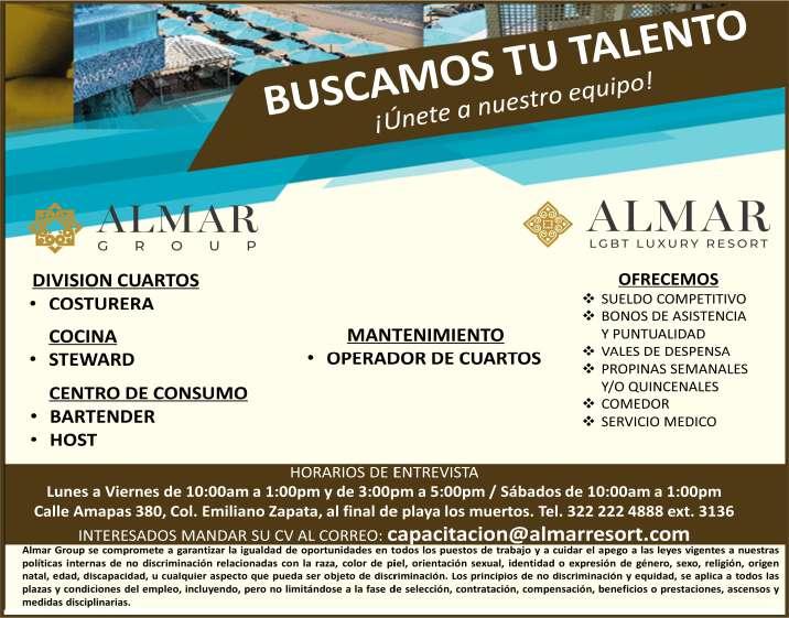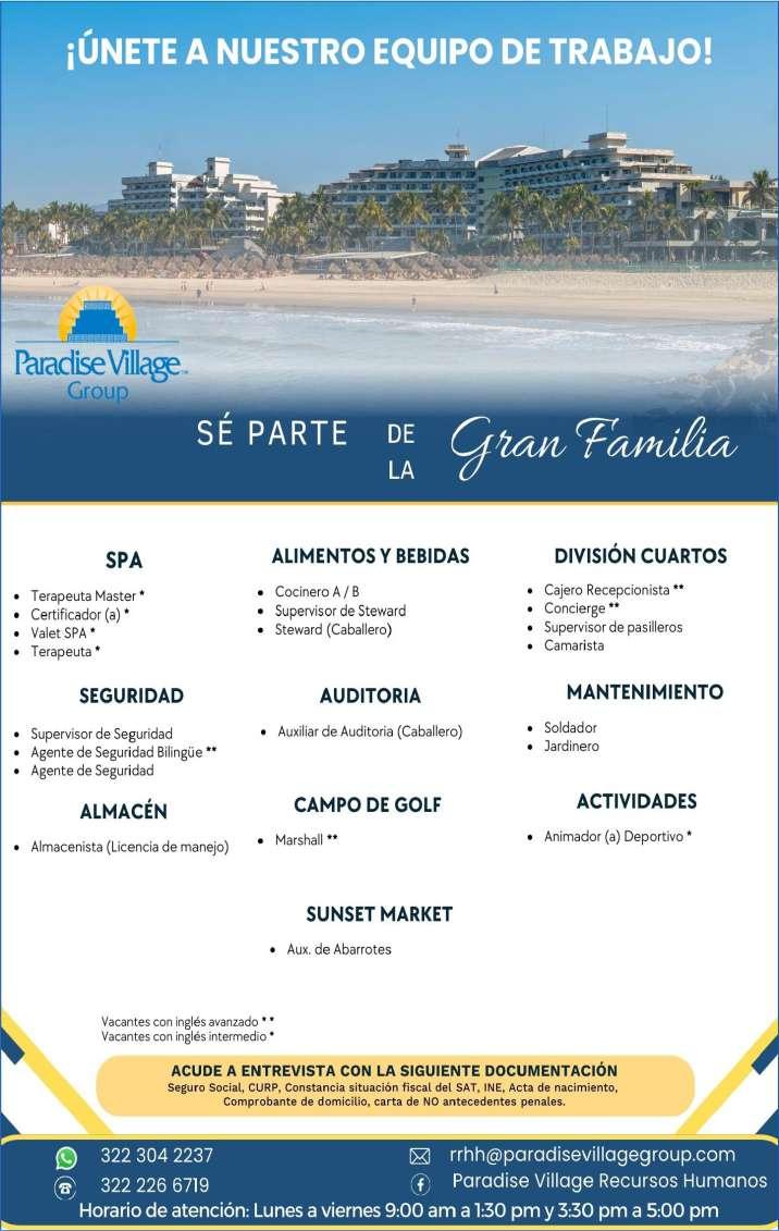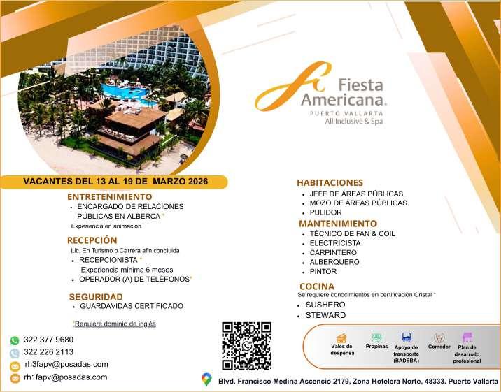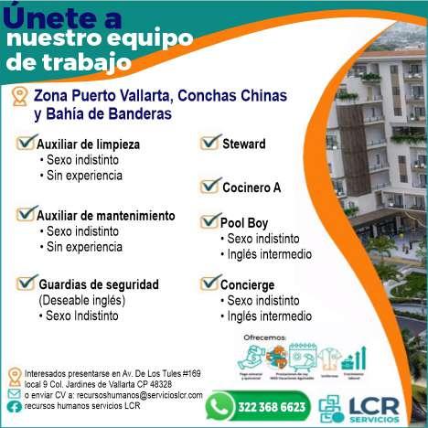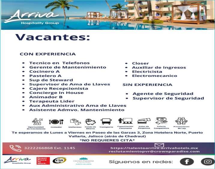 Importante hotel en Marina Vallarta solicita: Cocinero A, Operador de Cuartos, Fogonero, Electricista, Plomero, Auxiliar Contable, Animador, Mozo de Áreas Públicas. Informes solo