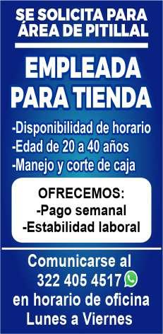 Buscamos para área Pitillal, Empleada para Tienda, disponibilidad de horario, edad de 20 a 40 años, manejo y corte de caja, ofrecemos pago semanal y estabilidad laboral. Comunicarse por WhatsApp al. 322 40 545-17.+