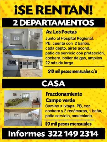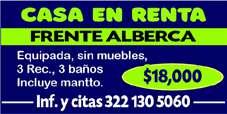 dín casa, 2 veces por mes, viva cerca Conchas Chinas, por día. $500. 322 29 281-83.*