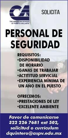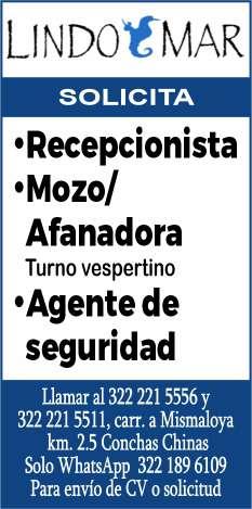 Se solicita el siguiente personal: Recepcionista, Mozo/Afanadora turno vespertino, Agente de Seguridad. Llamar al. 322 22 155-56.+