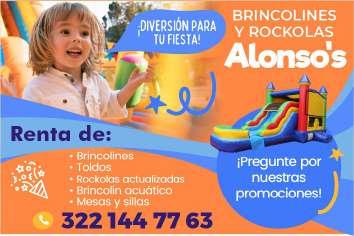 Brincolines y rockolas en renta, brincolines acuáticos, mobiliario, toldos, decoración con globos, taquizas, mantelería, toro mecánico. Informes. 322 13 623-61, 322 19 400-90.+
