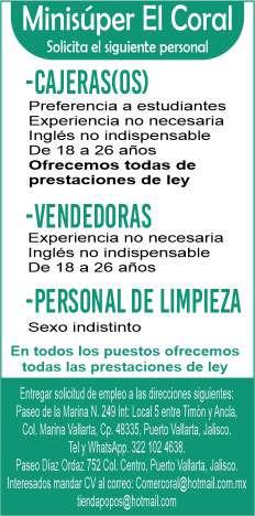 Personal para el área de ventas. Interesados comunicarse al. 322 15 967-07.+