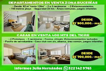 Departamentos en venta desde 82 M2 hasta 128 M2, 2 0 3 Rec., 2 estacionamientos, seguridad 24 hrs. Desde $3´900,000 mxn. Inf. 322 14 297-63.+