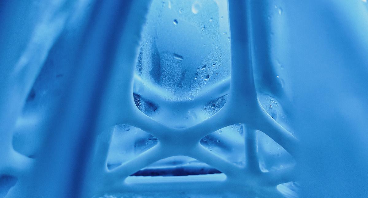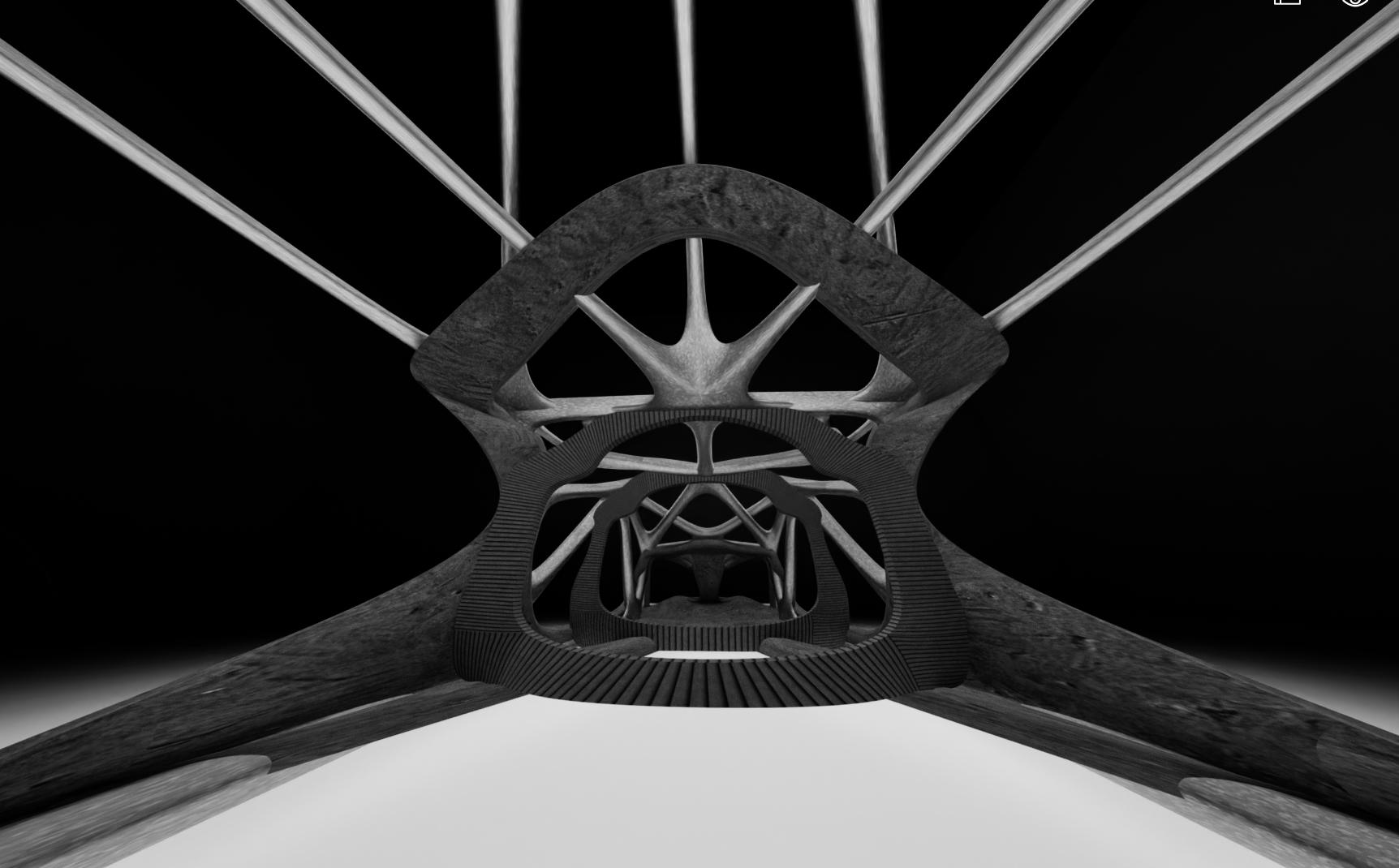 Inspired by bone structures and the tension of childbirth, it operates as a monocoque shell where structure and skin are integrated. The form creates a cocoon-like enclosure, translating tension into protection.