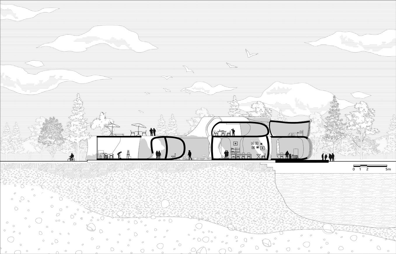 The building bridges the two sides of the filter bed, linking past and present through inhabitation. It transforms the site into a quiet landscape of water, memory, and making.