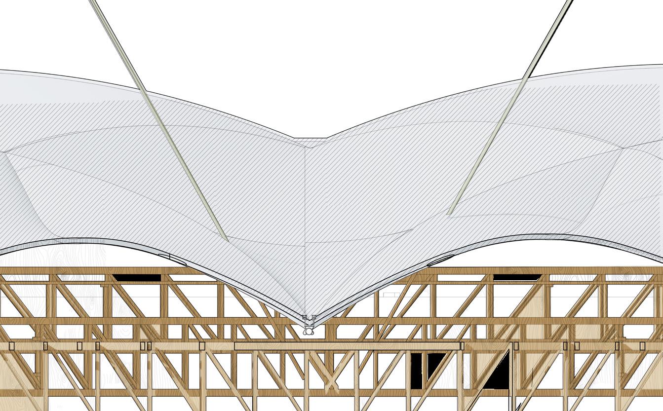 ETFE (ethylene tetrafluoroethylene) is used, while PTFE is stiffer and more opaque, ETFE offers improved insulation and daylighting performance. The ETFE membrane is typically tensioned and attached to the timber trusses or a secondary frame using clamping systems. A double-layer ETFE system with printed patterns can be used to enhance performance—allowing natural ventilationwhile reducing solar gain, thereby helping to prevent overheating during summer.