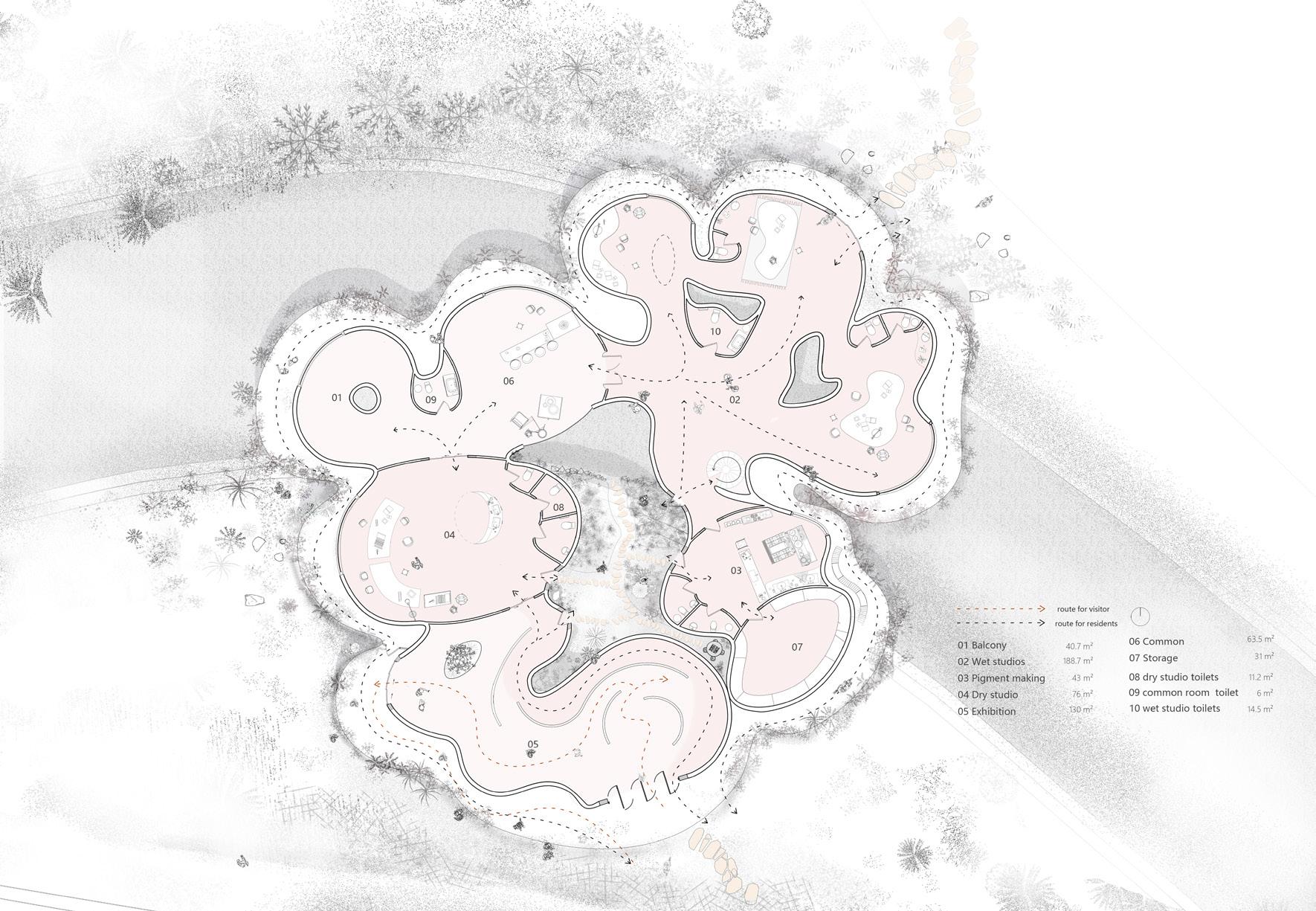 Spaces for painting, pigment-making, and dwelling unfold along a fluid path. Slow movement through light, moisture, and material creates an experience that echoes the gradual process of watercolour.