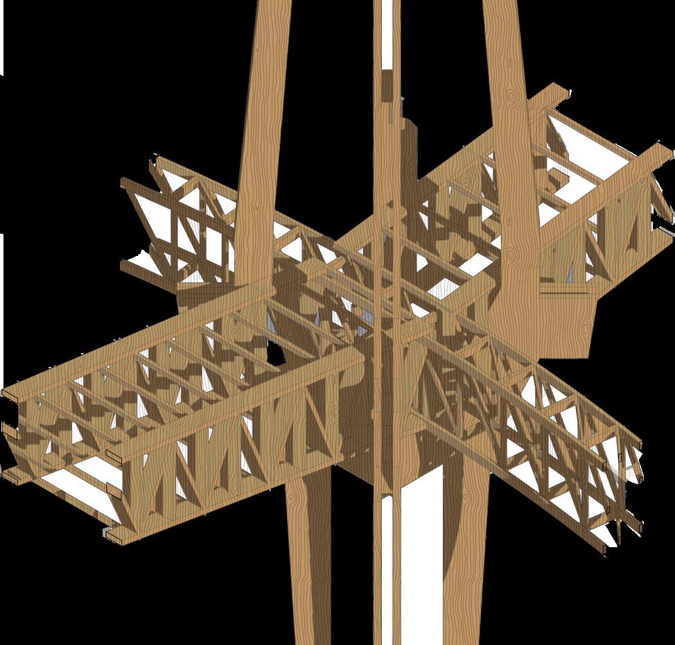 The new design of the O2 incorporates primary and secondary timber trusses, which are supported by a timber-tower mast. This is implemented in addition to the modular cable-stayed structure, enhancing the building’s resilience and modularity.