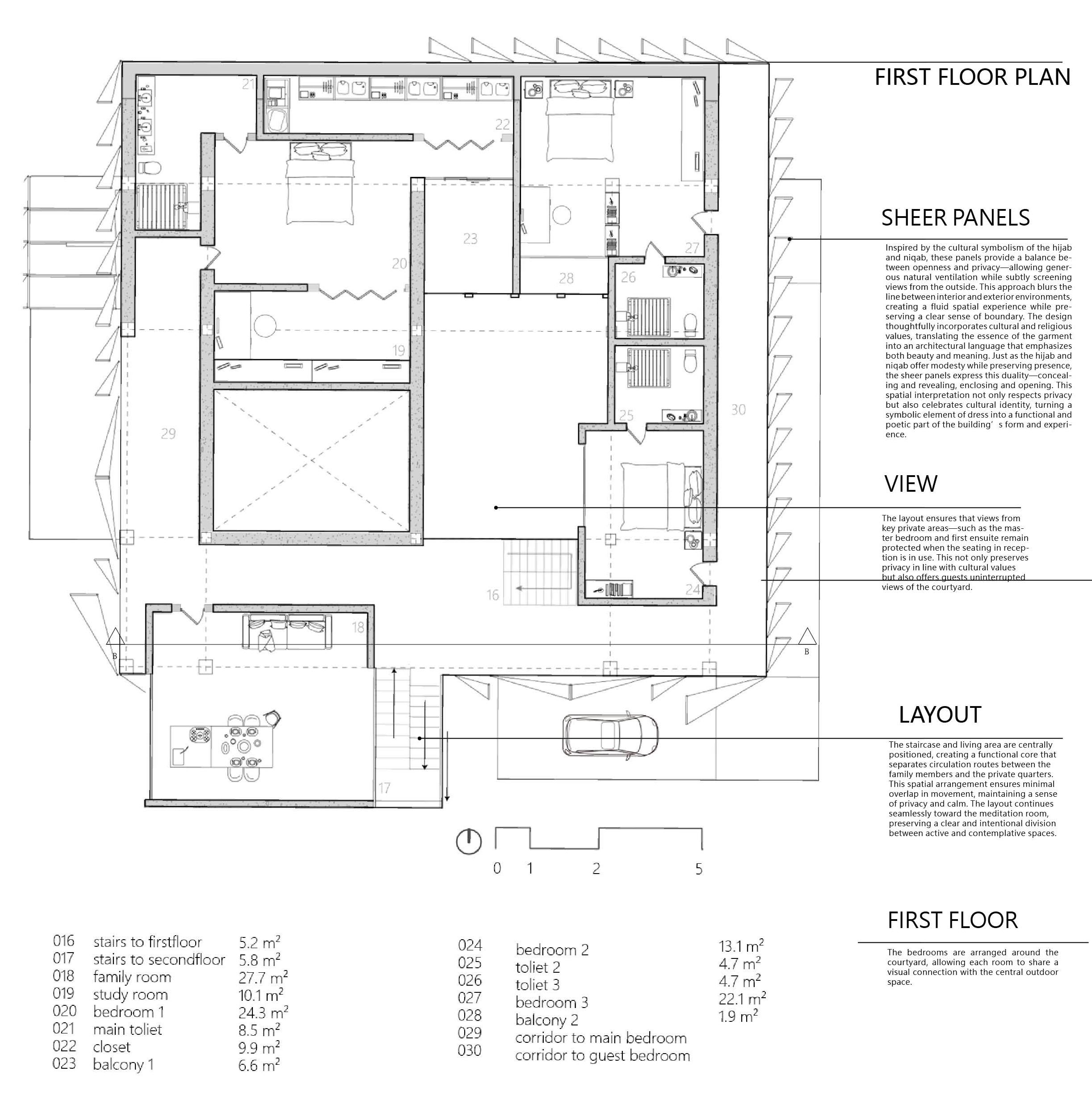Inspired by the cultural meaning of the Hijab, the design uses a layered veil-like façade to reinterpret ideas of protection, modesty, and identity. This lightweight outer skin filters light, air, and views, creating privacy, improving comfort, and reducing solar heat gain.