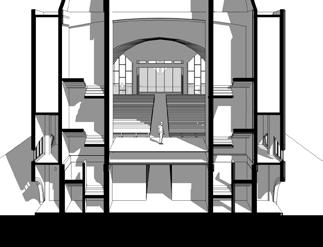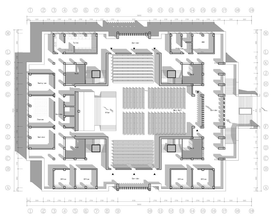 The ancillary spaces develop organically from this cross-shaped floor plan, with peripheral corridors naturally creating four interior courtyards. Staircases are positioned along the courtyard edges, improving ventilation and lighting conditions throughout the building, while also enriching the spatial experience of moving through the church.