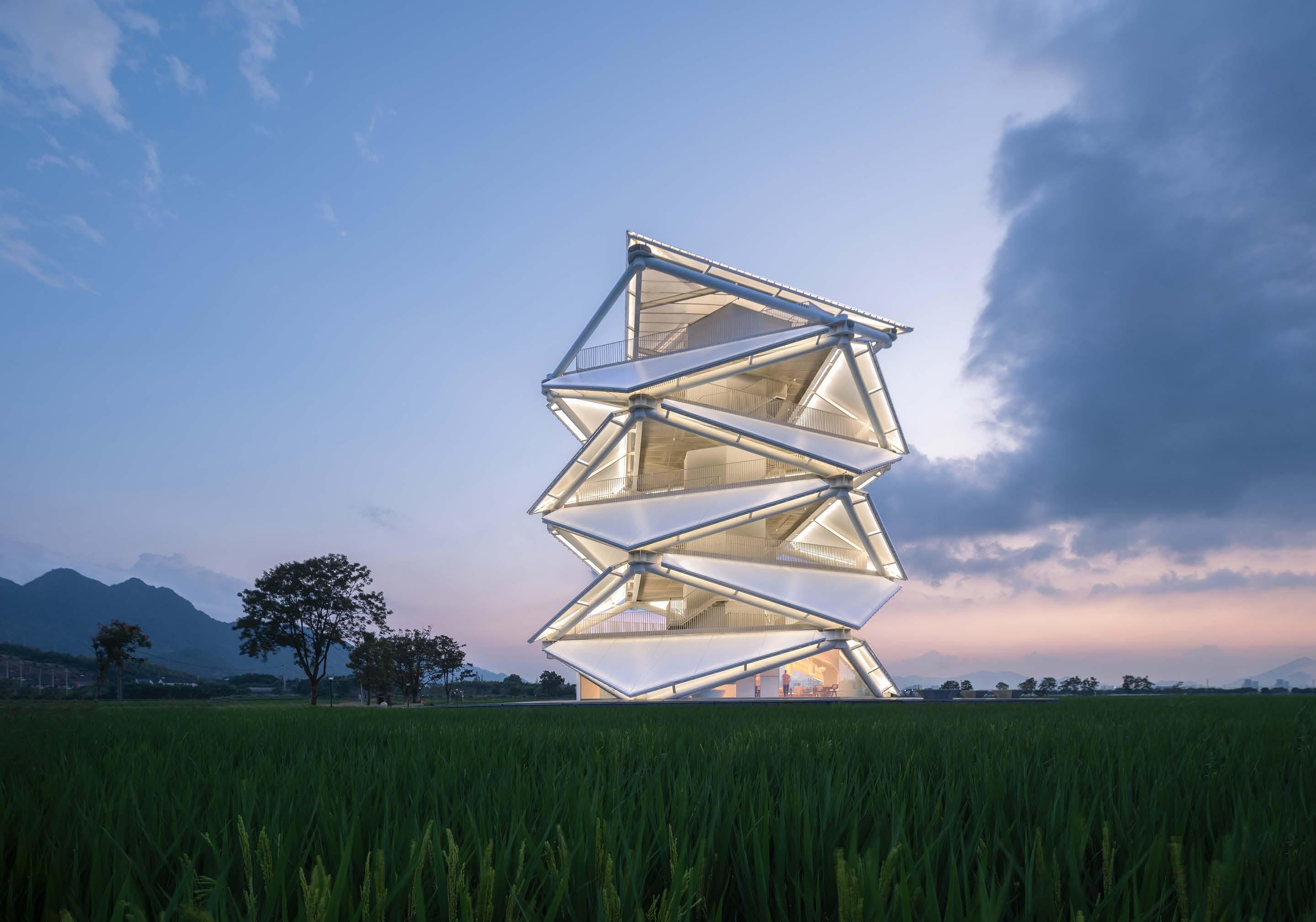 The Rice Sheaf Observation Tower stands as the most iconic structure in the "Ten Thousand Mu of Square Fields" project in Xibu Street, Fenghua District, Ningbo. Its completion provides the local countryside with a new viewpoint and social gathering spot. Rising 23 meters high, the tower is centrally located within the nationally designated Modern Agricultural Demonstration Zone. Like a sculpture, it spirals upward from the rice fields. The triangular elements and white membrane define its minimalist design language, giving it a strong presence within the rural landscape.