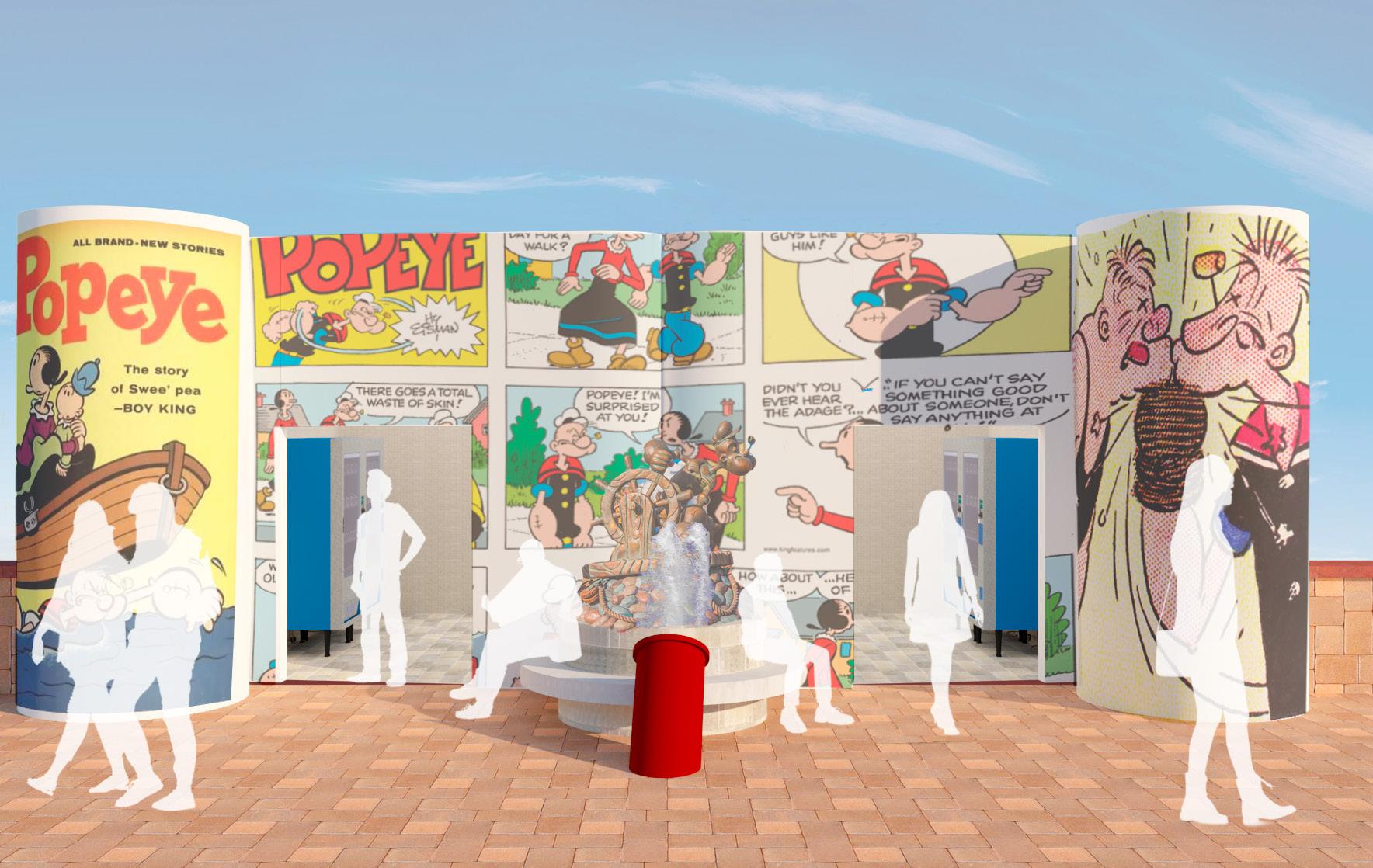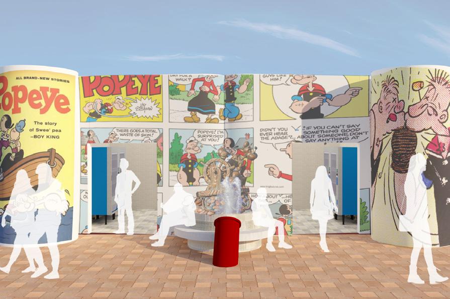 In this project, when tasked with creating an interior design for a public restroom, the decision was quickly made to design a Public Bathroom in a Theme Park. Taking inspiration from the famous Universal Studios area ‘Toon Lagoon,’ this project aimed to bring an immersive experience to a location that is often not given much thought in theme park design. Choosing Popeye and his classic comics as the central theme, you can observe both inside and outside the facility the shapes and details carefully considered for this space. Even its facade resembles a comic book featuring the world famous character.