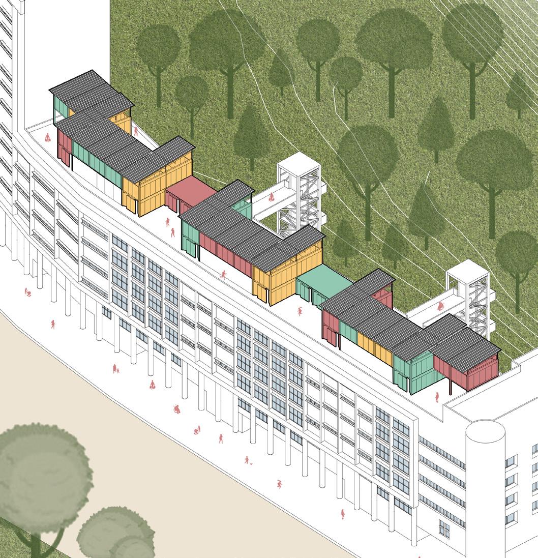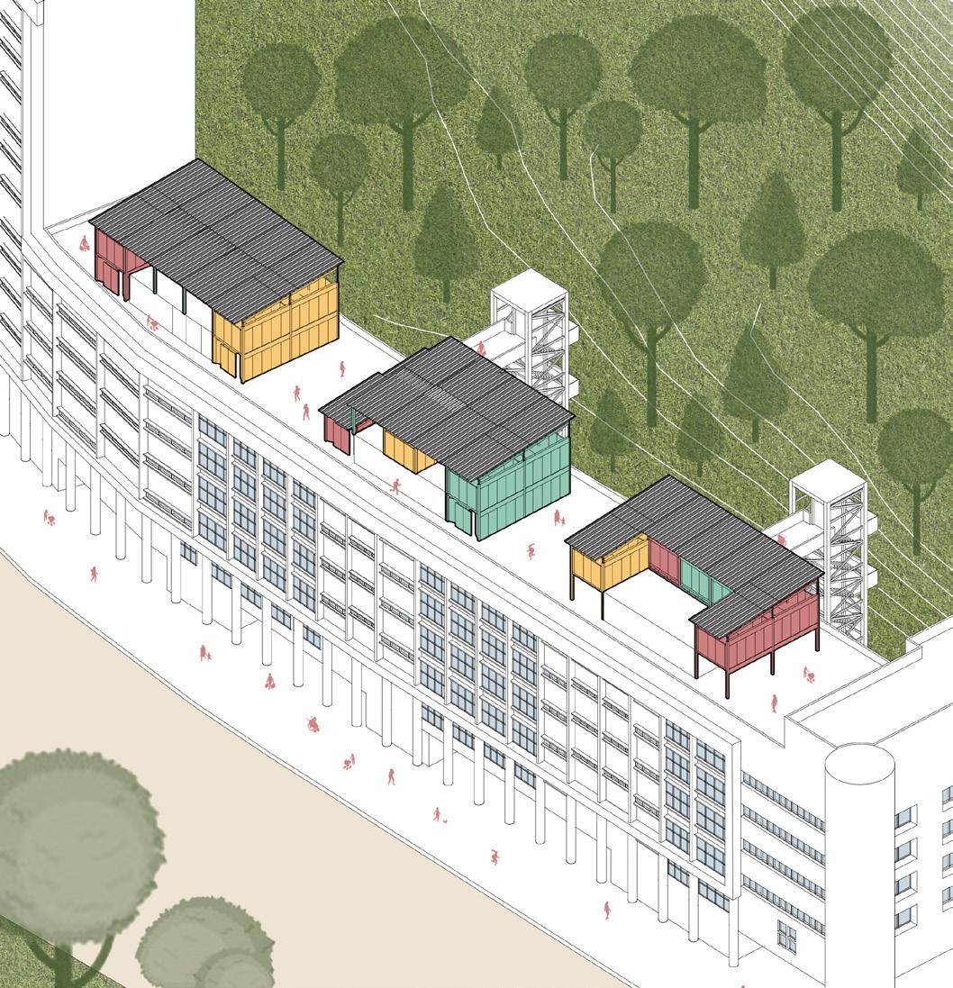 The module is versatile, applicable to various terraces, promoting expansion and adaptation. We use MLC, a sustainable, cost-effective, and durable material. We incorporate photovoltaic panels and a rainwater harvesting system for energy and water self-sufficiency. Financing will be through land development, seeking economic self-sustainability.