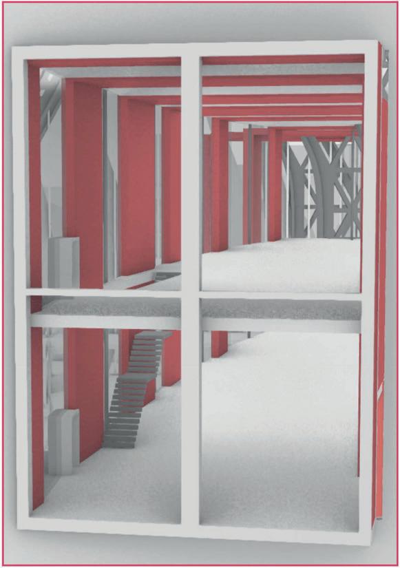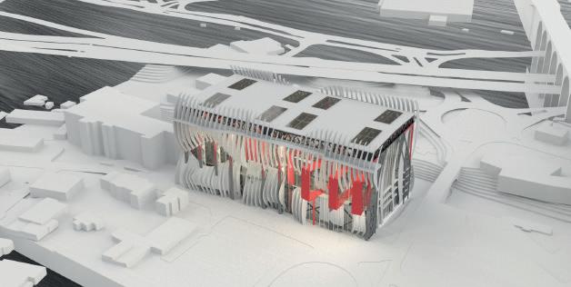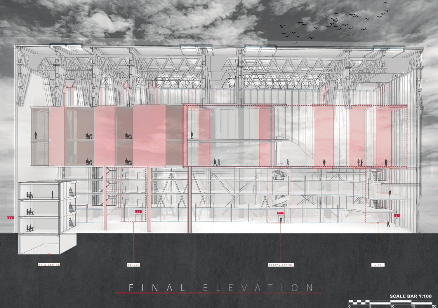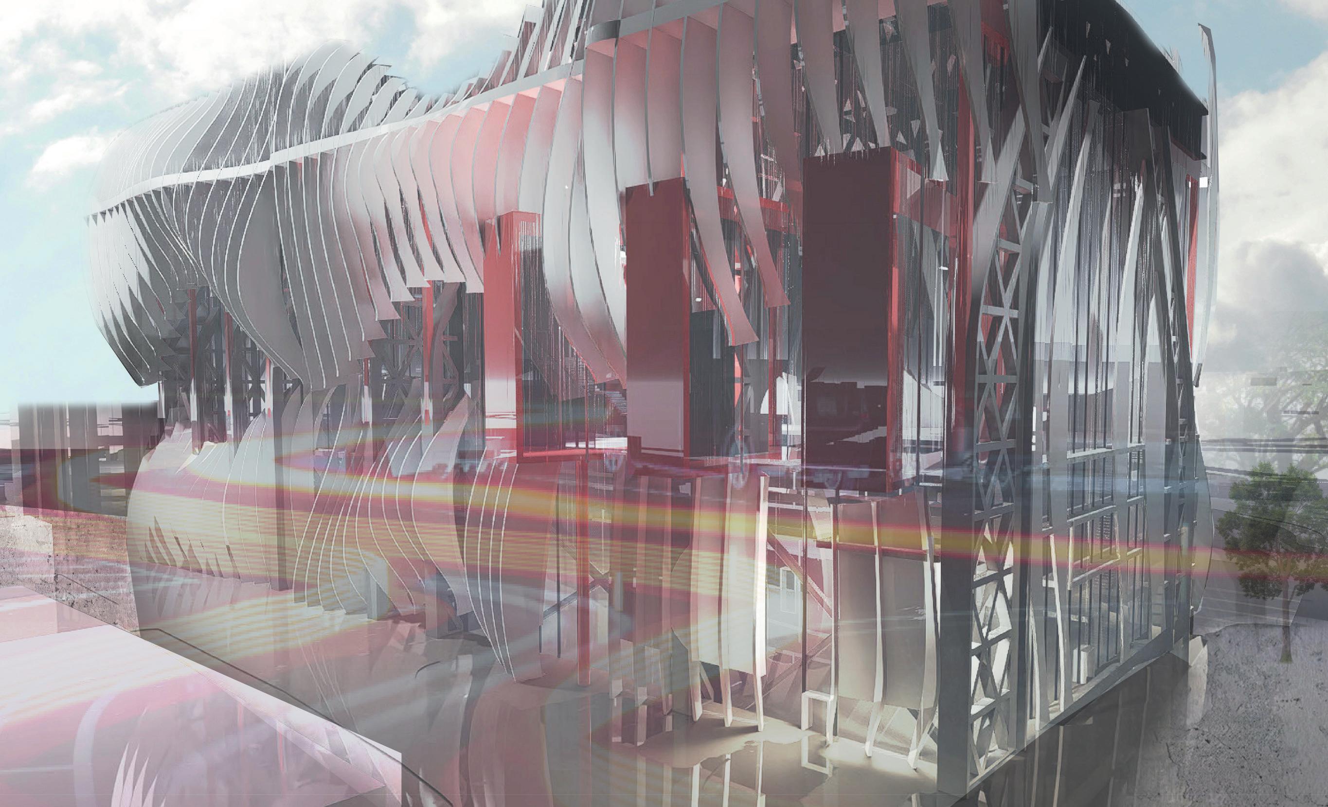 This project located in the centre of the Stockport, in response to the local develop plan, the project aim is to introduce newly merging technology to the local, the building provide rentable work spaces and can be used for exhibition and educational purposes. It was inspired by the functionality of skeleton structure, absorb the ‘slices’ features then further build up a link with the film making industry, a bold red ‘pipe’ is slices up and goes though the entire building, combines with the wavey envelope making the building noticeable and stand out in the cite.