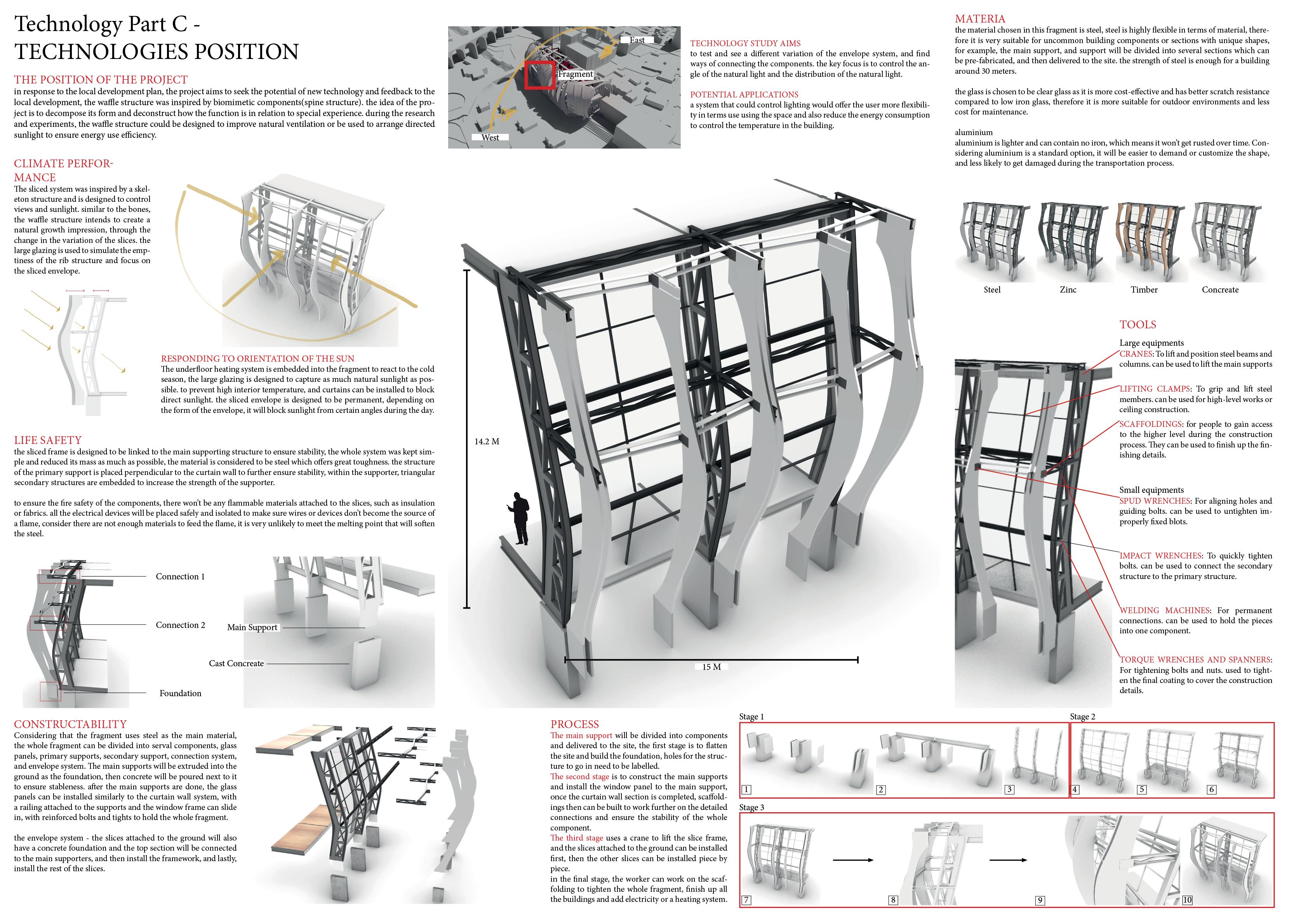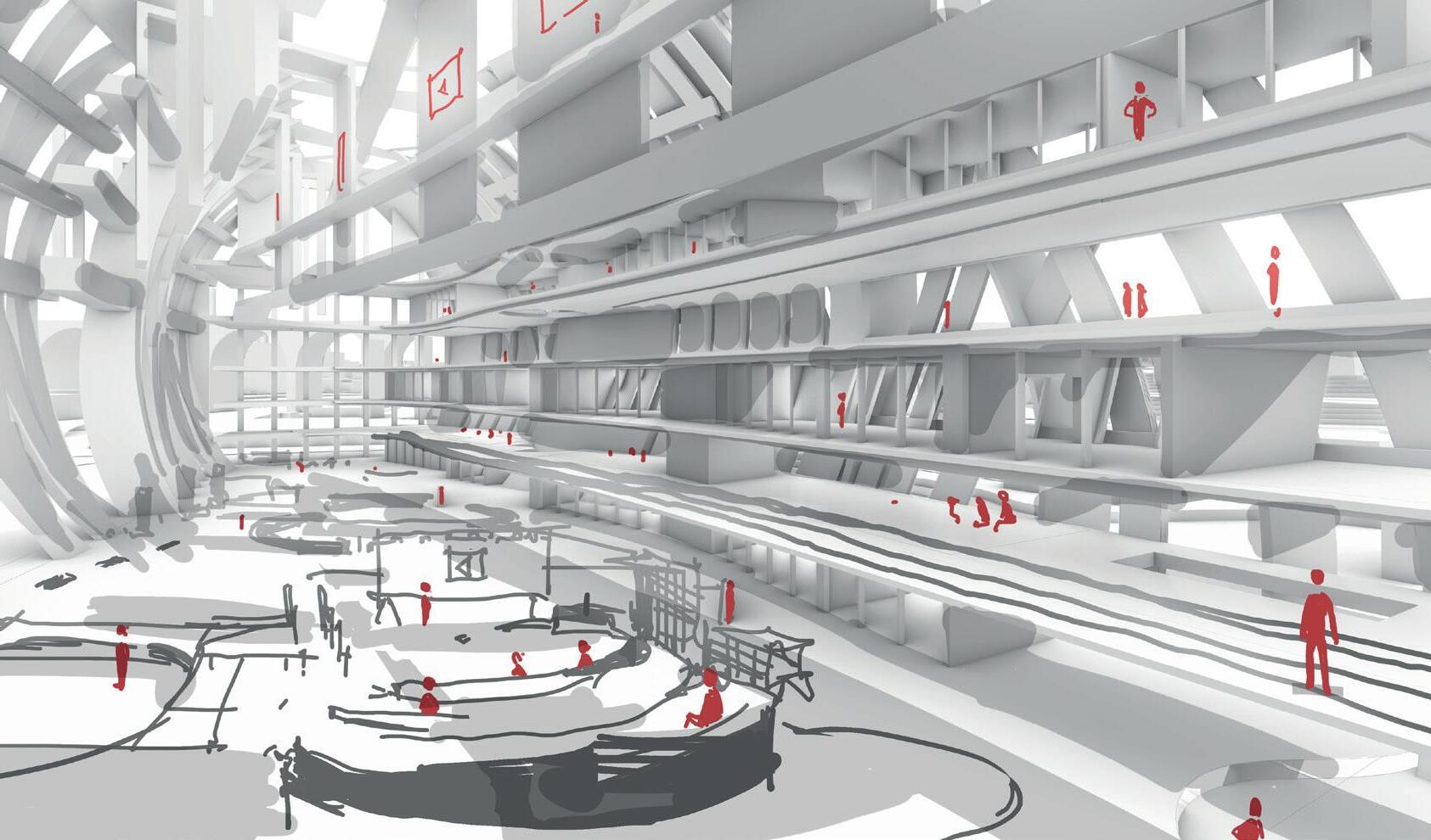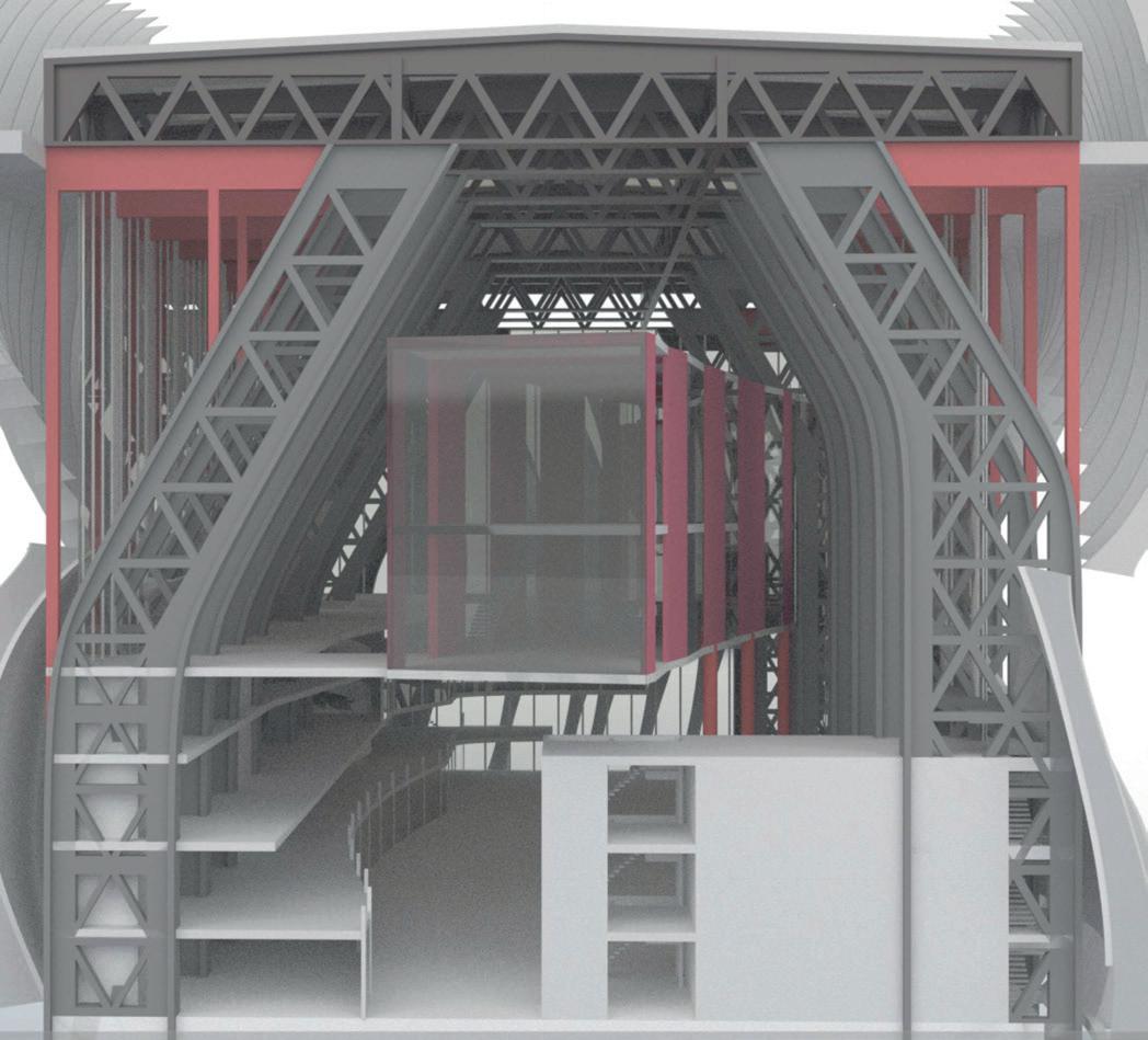 This project located in the centre of the Stockport, in response to the local develop plan, the project aim is to introduce newly merging technology to the local, the building provide rentable work spaces and can be used for exhibition and educational purposes. It was inspired by the functionality of skeleton structure, absorb the ‘slices’ features then further build up a link with the film making industry, a bold red ‘pipe’ is slices up and goes though the entire building, combines with the wavey envelope making the building noticeable and stand out in the cite.