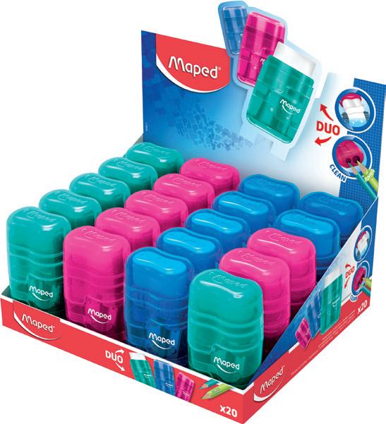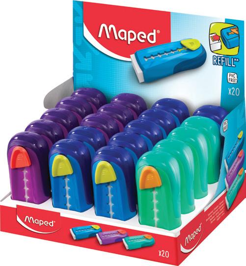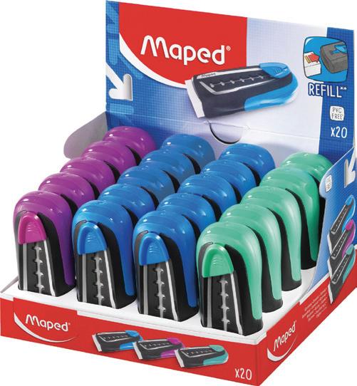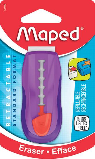 DISPLAYS & INDEXES © Maped 2023 81 DISPLAYS & DISPLAYABLE INNERS • Mix & match the 2-Hole sharpener & eraser parts to make your own design! CONNECT 2-HOLE SHARPENER & ERASERS SKU DESCRIPTION QTY PAGE BARCODE 049211 Connect DUO 2-Hole Canister Pencil Sharpener & Eraser Combo Display x20 20 / 320 42 3 154140 492113 • 1-hole design with metal sharpening insert - perfect for older students! TONIC 1-HOLE CANISTER SHARPENERS SKU DESCRIPTION QTY PAGE BARCODE 068017 Tonic 1-Hole Canister Pencil Sharpener with Metal Insert PDQ Display x16 16 / 128 41 13154140680173 506800 Tonic 1-Hole Canister Pencil Sharpener with Metal Insert Display x18 18 / 432 41 3 154145 068009 • 2-Hole sharpener with metal insert and integrated shatter resistant canister TONIC 2-HOLE CANISTER SHARPENERS SKU DESCRIPTION QTY PAGE BARCODE 506900 Tonic 2-Hole Canister Pencil Sharpener with Metal Insert Display x18 18 / 324 41 3 154145 069006 • Brand new, super-powerful eraser perfect for writing, drawing & more! TECHNIC EXPERT SOFT TOUCH ERASERS • Retractable eraser is great for home or school use! UNIVERSAL RETRACTABLE ERASERS SKU DESCRIPTION QTY PAGE BARCODE 105811 Technic Expert Soft-Touch Vinyl Eraser Display x20 20 / 480 44 3 154141 058110 SKU DESCRIPTION QTY PAGE BARCODE 512000 Universal Retractable Technic Vinyl Eraser Display x20 20 / 240 44 3 154145 120004 • Super soft, premium eraser is perfect for serious art use! TECHNIC EXPERT RETRACTABLE ERASERS SKU DESCRIPTION QTY PAGE BARCODE 116449 Technic Expert Universal Retractable Soft-Touch Vinyl Eraser Display x20 20 / 240 44 3 154141 164491