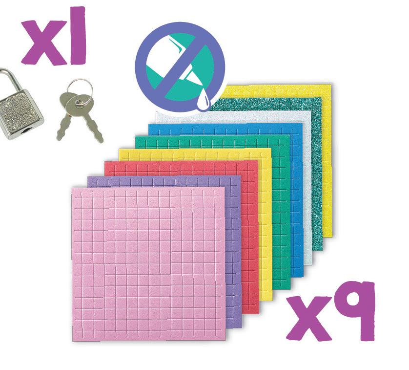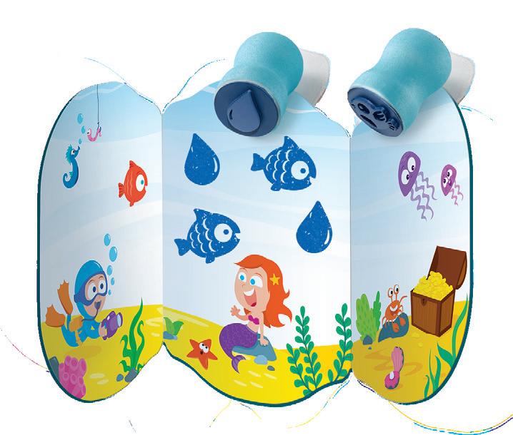 Contains: Contains: 3 750ml Fingerpaint tubes (Red, Yellow & Blue), 4 stencil cards, 2 sheets of decorative stickers & a tablecloth all packed in a reusable storage case 6 ergonomic Foam Stamps, 6 posters to decorate & a Blue Ink Pad all packed in a reusable storage case