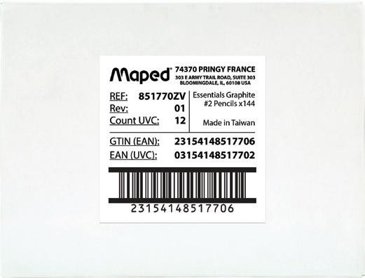 DISPLAYS & INDEXES © Maped 2023 84 • A classic yellow pencil perfect for Back to School! ESSENTIALS #2 GRAPHITE PENCILS SKU DESCRIPTION QTY PAGE BARCODE 851770ZT Essentials Yellow Triangular Graphite #2 Pencils Bulk Pack x144 144 / 1728 35 3 154148 517702 • 2-Hole sharpener with integrated shatter-resistant canister Compass legs are durable metal construction for years of reliable school use • Plastic locking compass with integrated measuring arm and universal holder SHAKER 2-HOLE CANISTER SHARPENERS STUDY METAL COMPASSES PLASTIC LOCKING COMPASSES SKU DESCRIPTION QTY PAGE BARCODE 734755 Shaker 2-Hole Canister Pencil Sharpener Bulk Pack x150 150 / 600 38 3 154147 347553 SKU DESCRIPTION QTY PAGE BARCODE 719010 Study Metal Compass with Universal Holder Bulk Pack x100 100 / 600 48 3 154147 190104 SKU DESCRIPTION QTY PAGE BARCODE 37280 Plastic Locking Compass with Universal Holder Bulk Pack x50 50 / 300 48 0 79252 372807 • Blunt & Pointed 5" scissors perfect for BTS & school lists! ESSENTIALS SCHOOL SCISSORS 5" SKU DESCRIPTION QTY PAGE BARCODE 480159 Essentials School Scissors 5" Bulk Pack x50 - Blunt 50 / 600 66 3 154144 801591 480259 Essentials School Scissors 5" Bulk Pack x50 - Pointed 50 / 600 66 3 154144 802598 BULK PRODUCTS