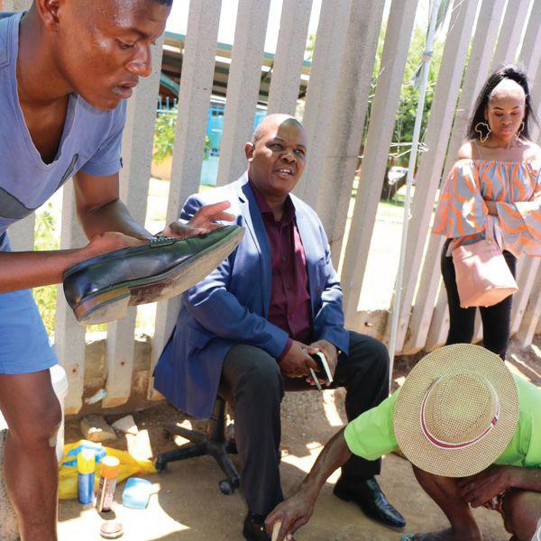 The Finance MEC Jacob Mamabolo started his ‘Back-to-School’ visit at the Asser Maloka Secondary School in Duduza (front page picture). He handed over new school bags to the learners and also got time to support a local business, Kasi Sneaker Care, took care of the MECs shoes.