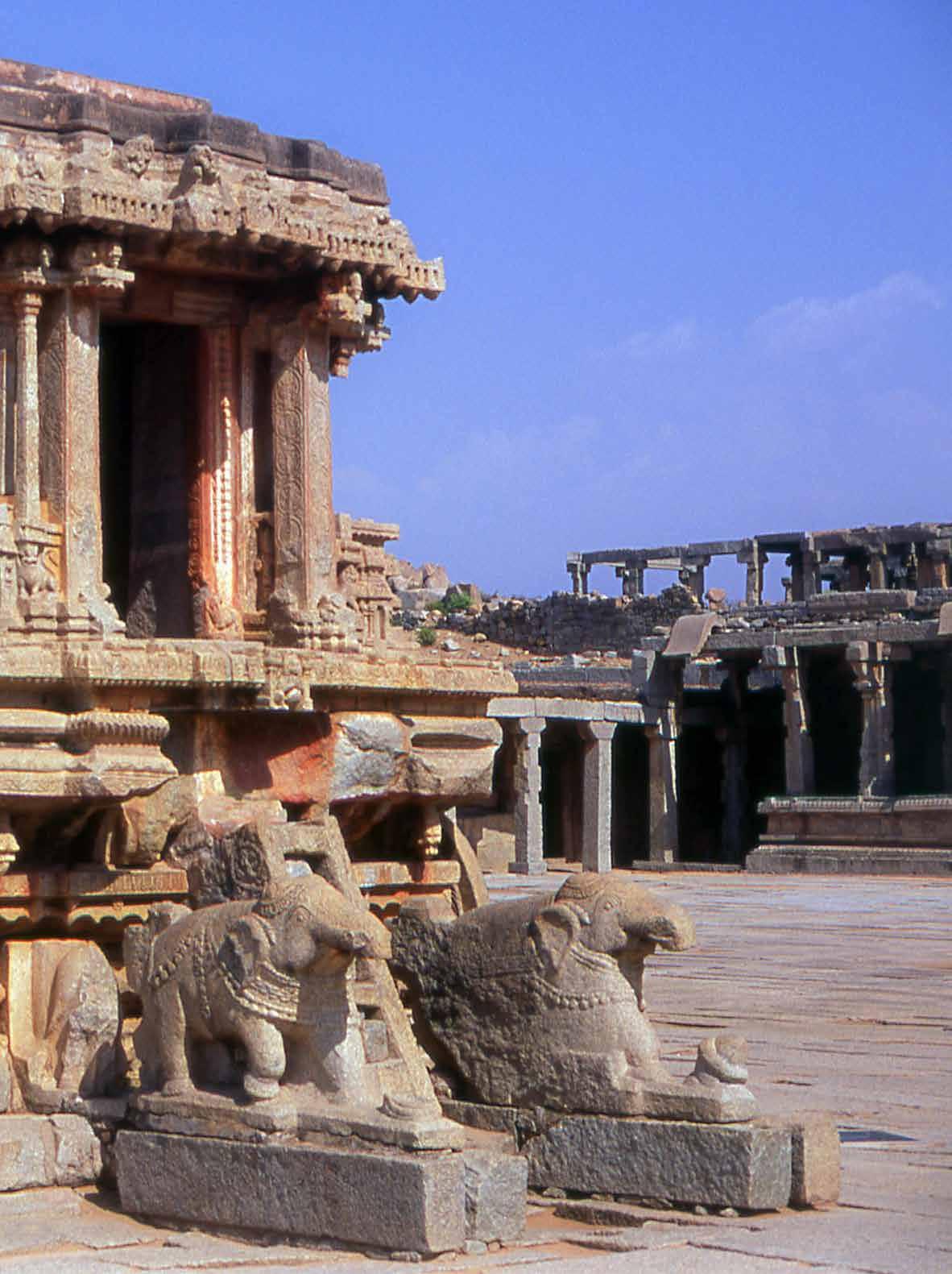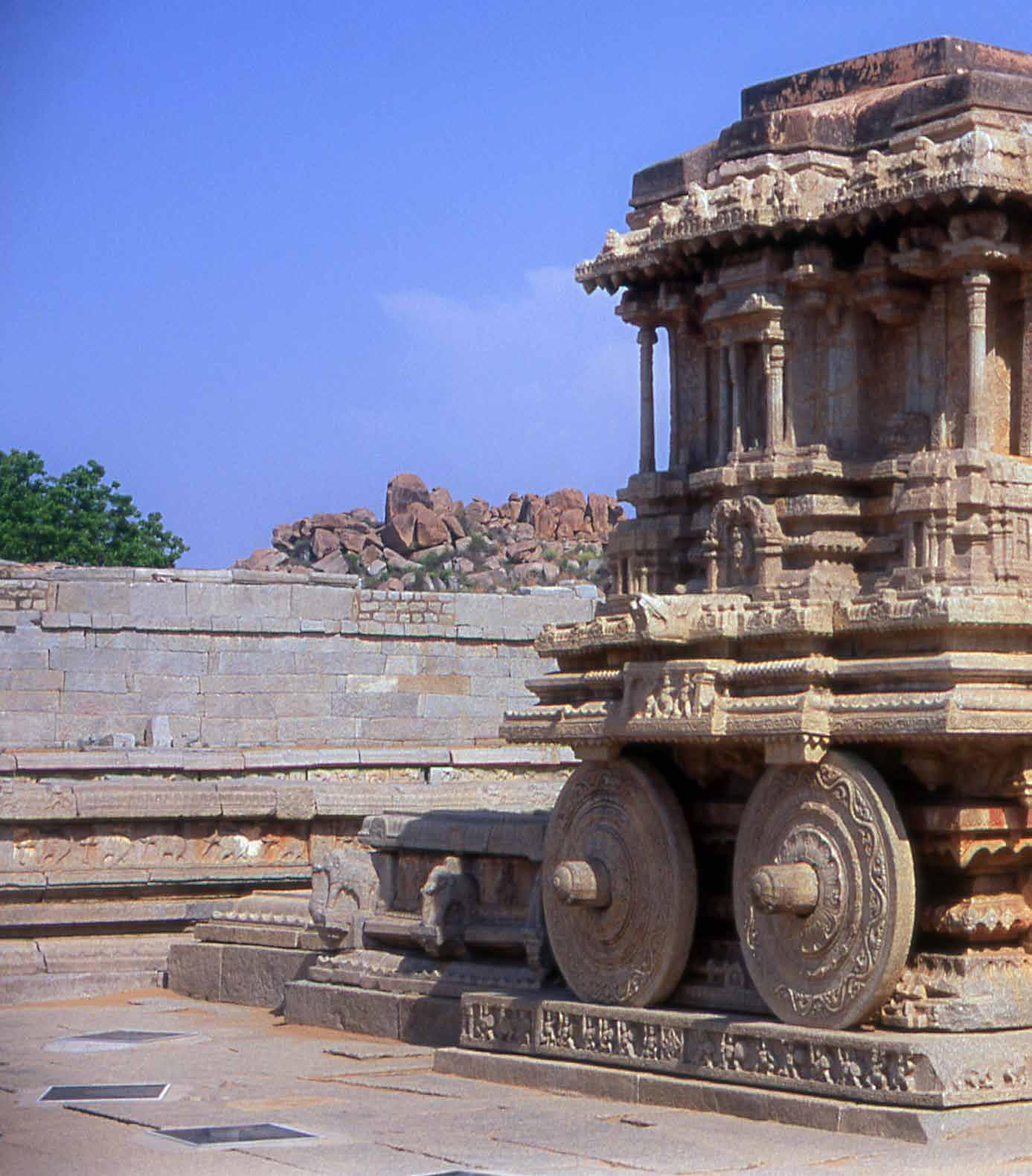 Pages 4–5 Stone chariot ratha vehicle Vishnu Vitthal Temple Hampi Vijayanagar World Heritage Deccan plateau Hospet Bellary Karnataka.