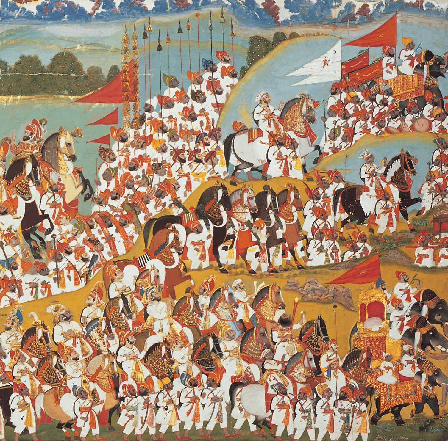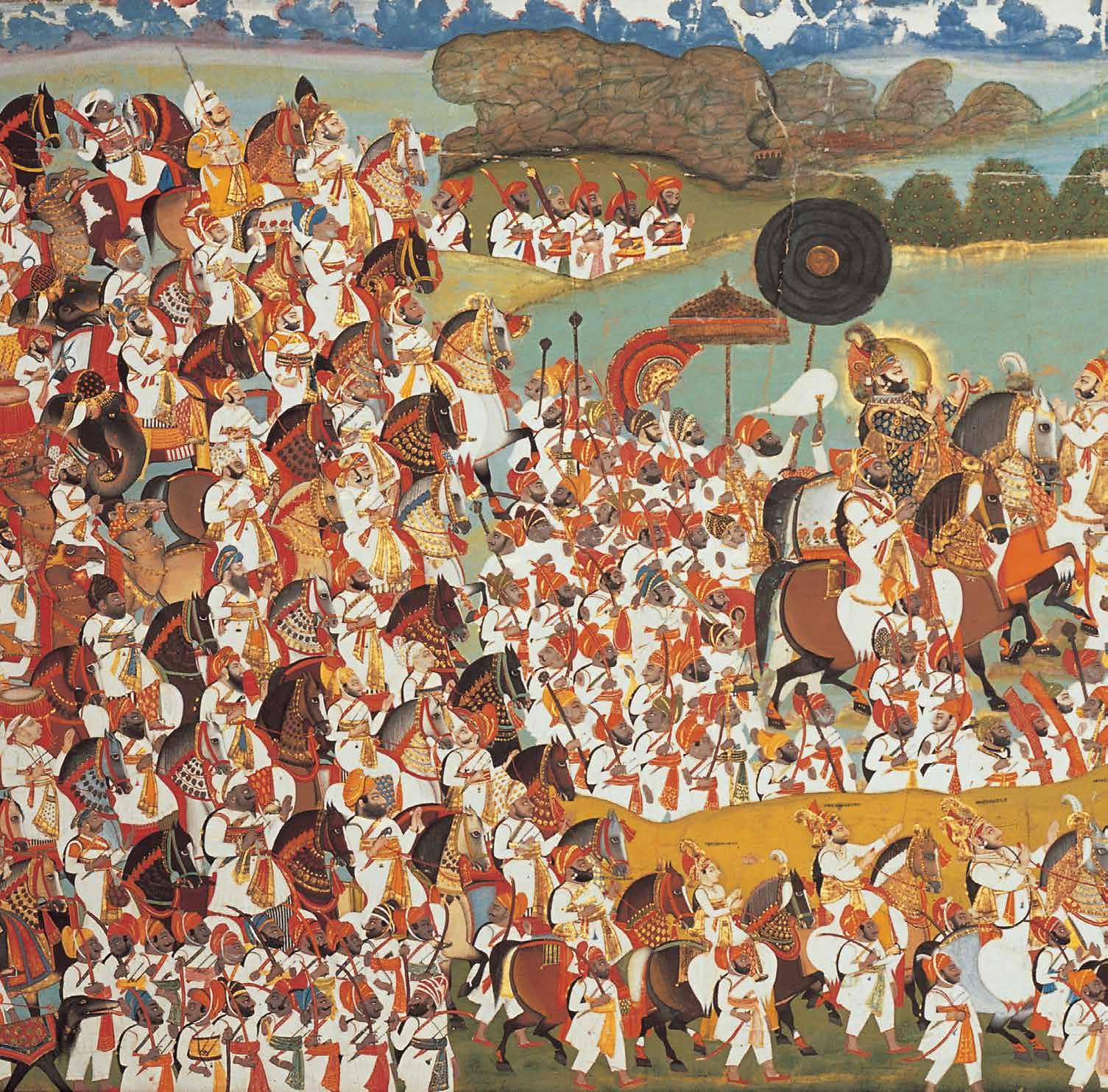 Pages 2–3 Maharana Bhim Singh riding in procession to Eklingji, Udaipur, 1802. Attributed to Bakhta.